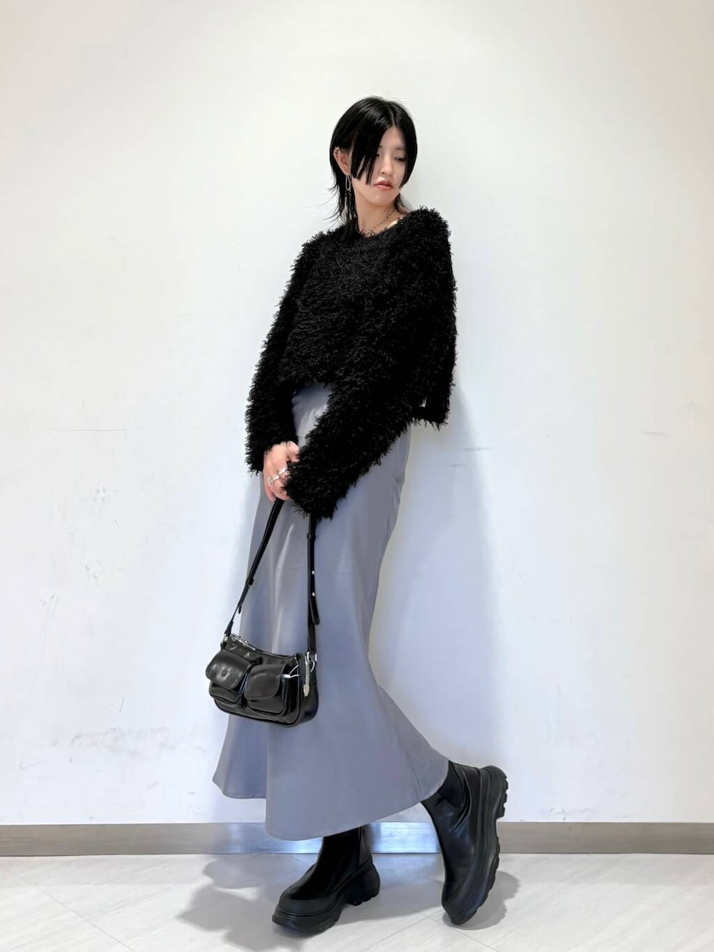 サテンの艶やかでキレイなマーメイドスカートと合わせることで、大人かわいいコーデに仕上がりました。