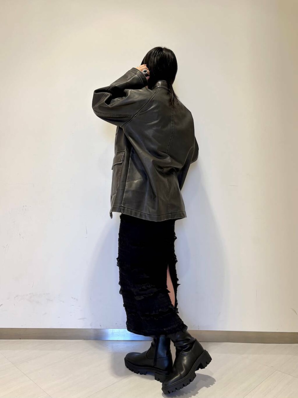 春の新作アウターが、メンズライクなデザインとビッグシルエットでハンサムな印象なので、トップスとスカートは甘めで女性らしいスタイルで甘辛ミックスにしました。