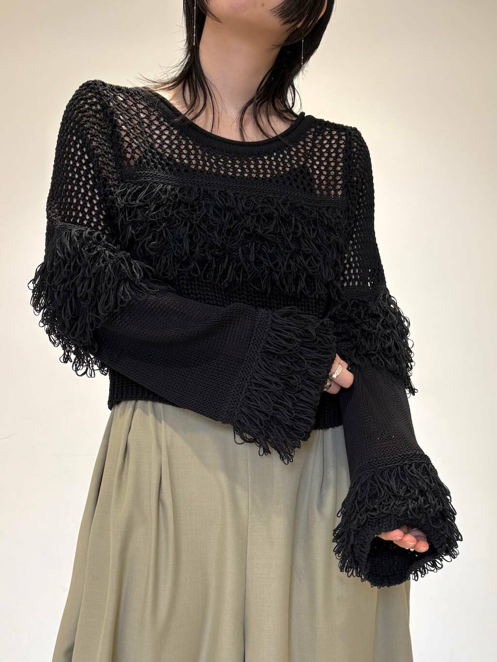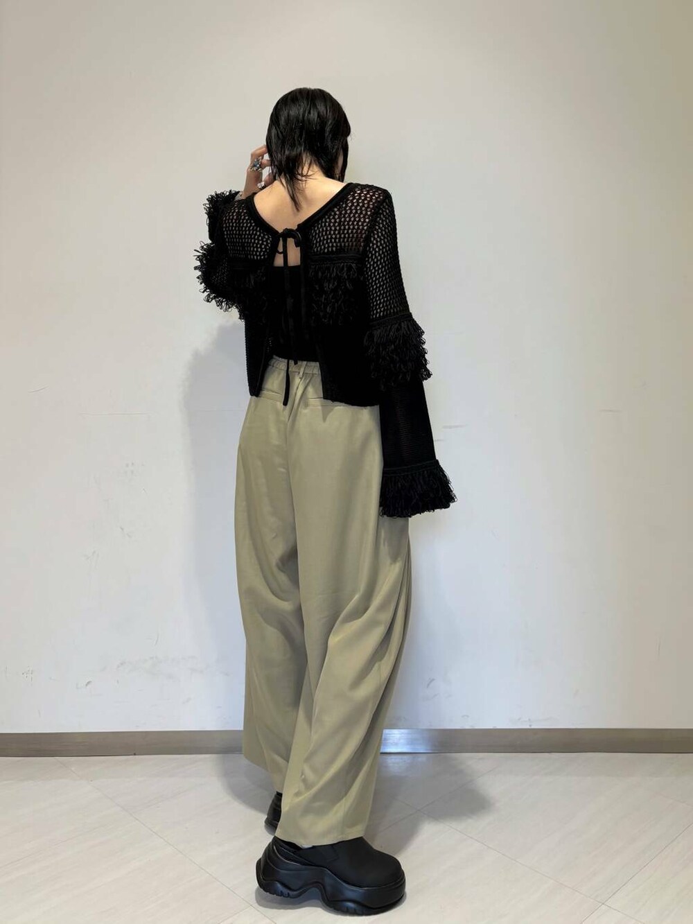 ループ編みニットは意外とコンパクトなので、ボリューム感たっぷりのパンツと合わせるとメリハリが出てスタイルアップが叶います