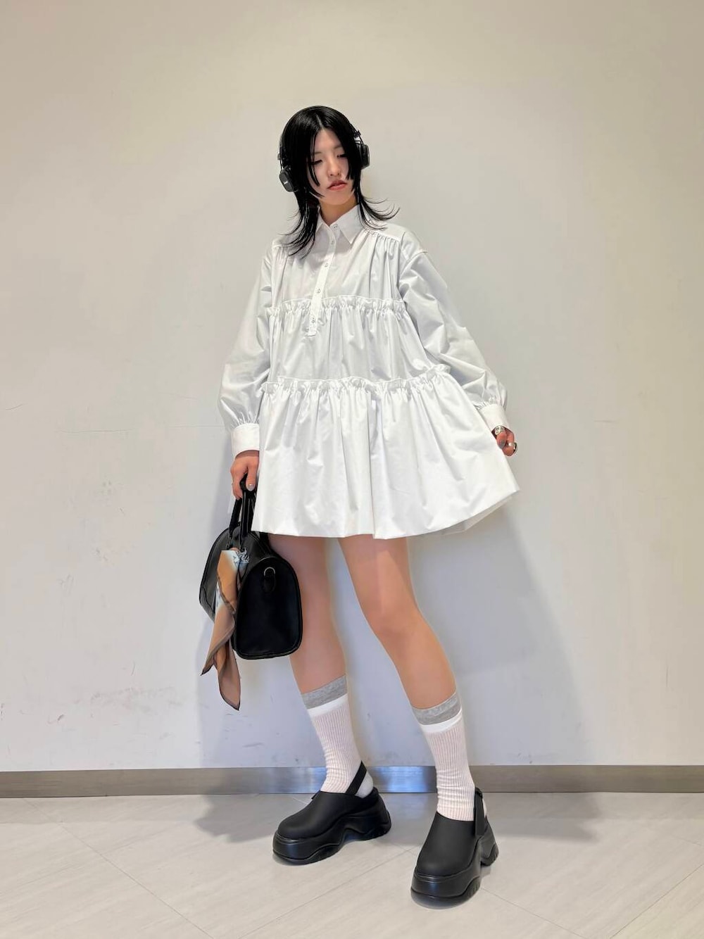 ボストンバッグや厚底サンダルなど、少しハンサムなアイテムを合わせることで甘辛ミックスなコーデに仕上げています。