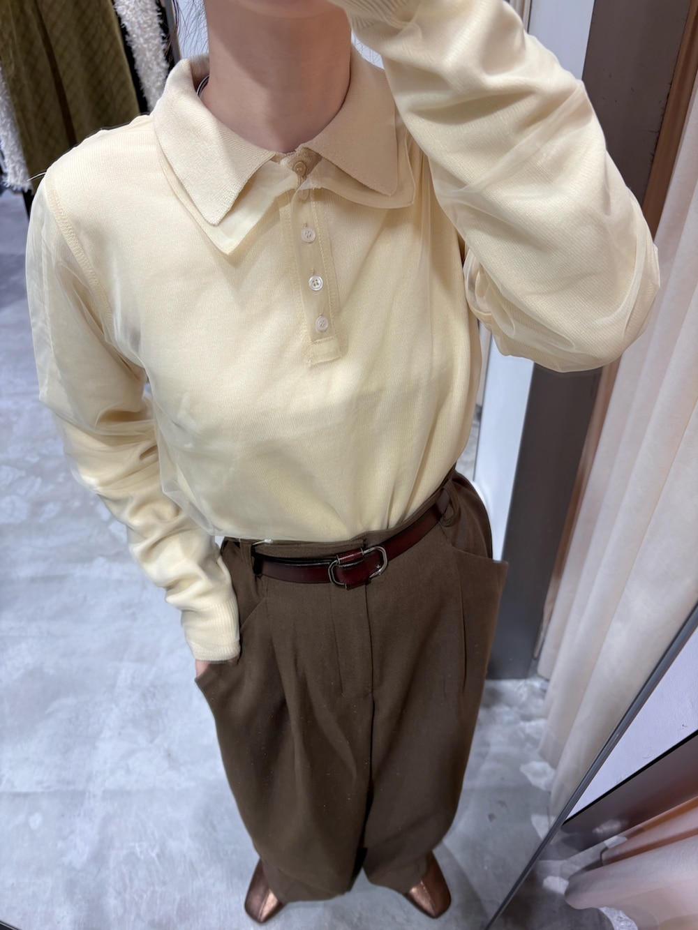トップスはポロニットなのでオフィスでも◎なんとシアーとのレイヤード仕様で別々に着用が出来ます!周りと差がつくアイテム✨