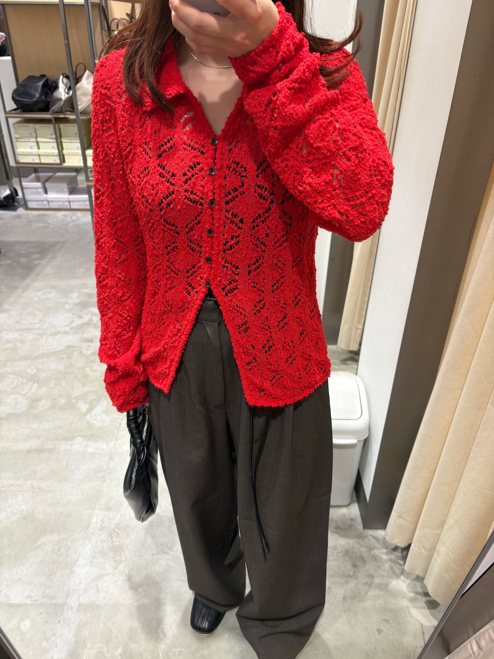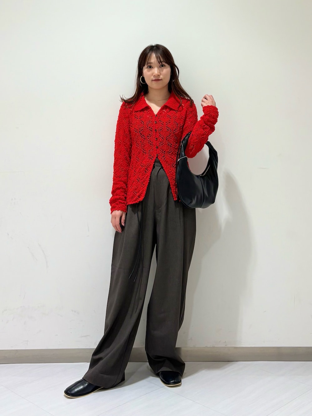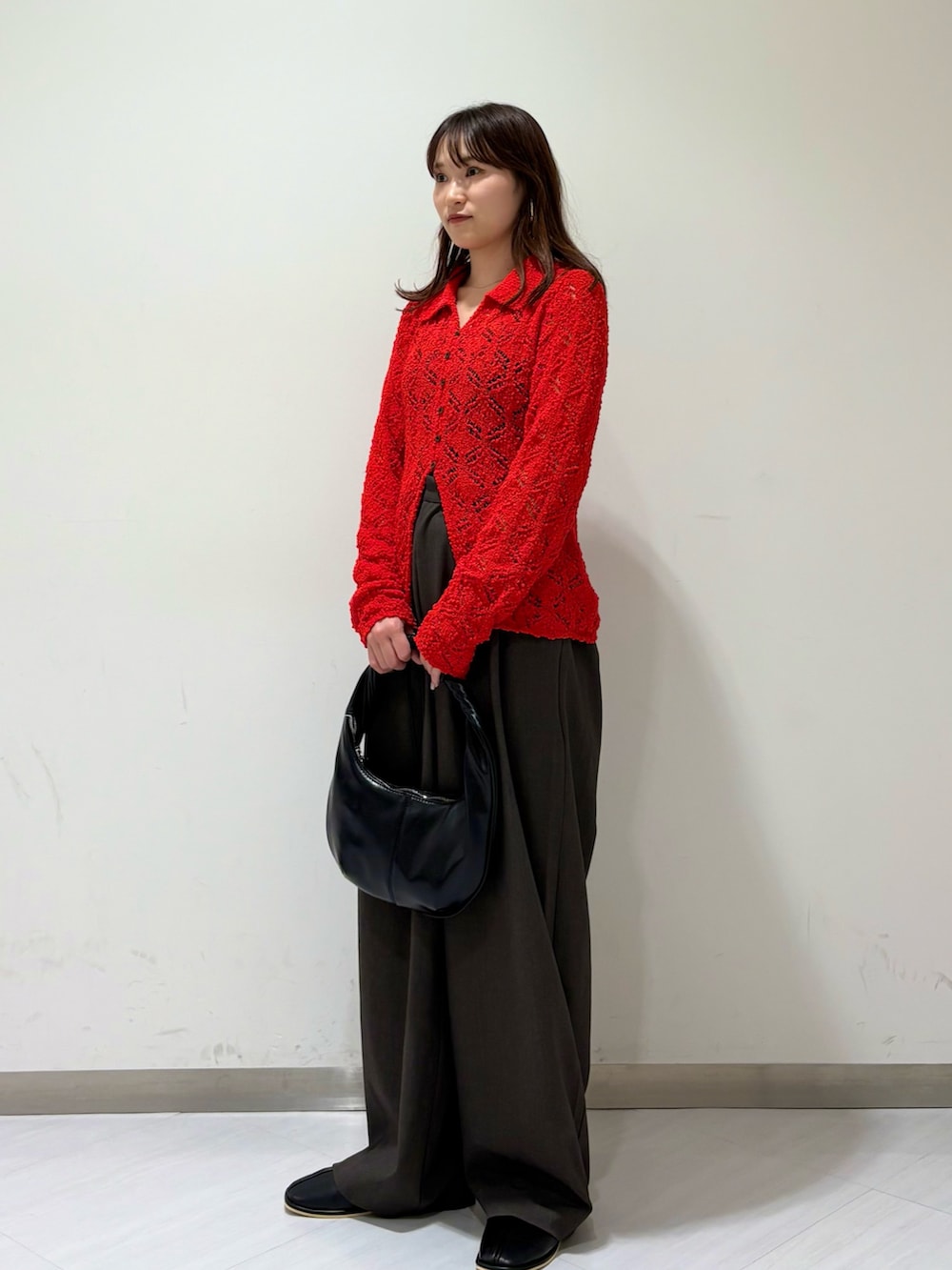 今回はパッと目を引く真っ赤なレースカーディガンを主役にしたスタイリングを組んでみました✨
