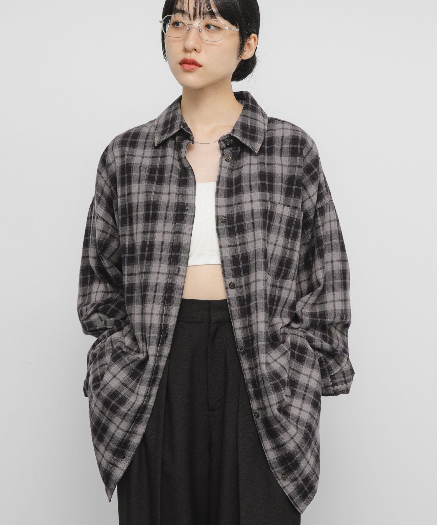 ニットにチェックシャツをレイヤードしたのがこのコーデのポイントです◎
