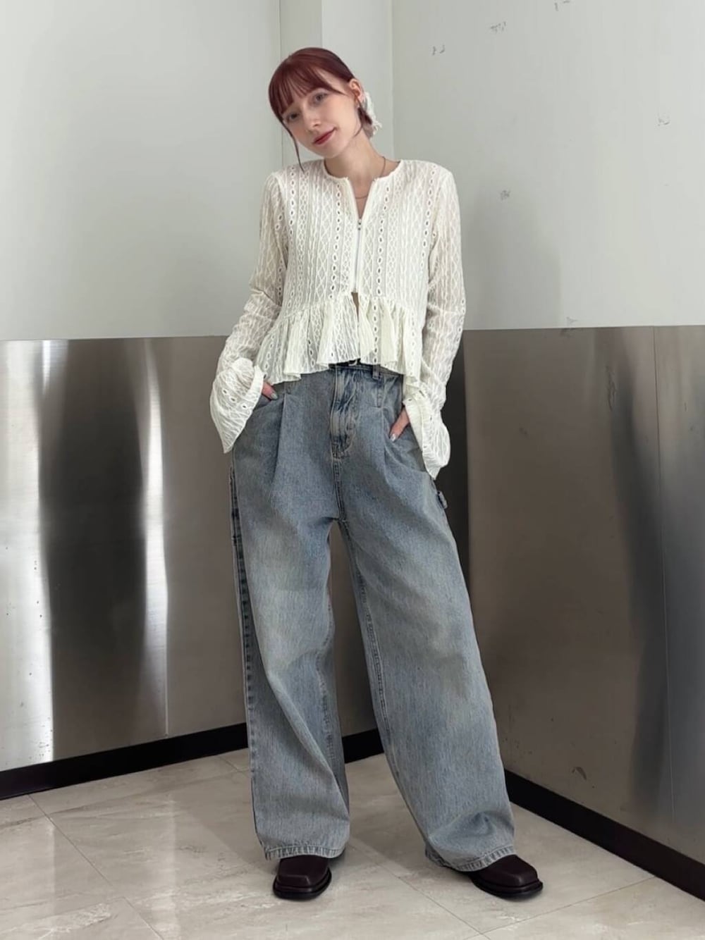 ウォッシュ加工っぽい色合いのデニムにレーストップスを合わせてみました〜✨
