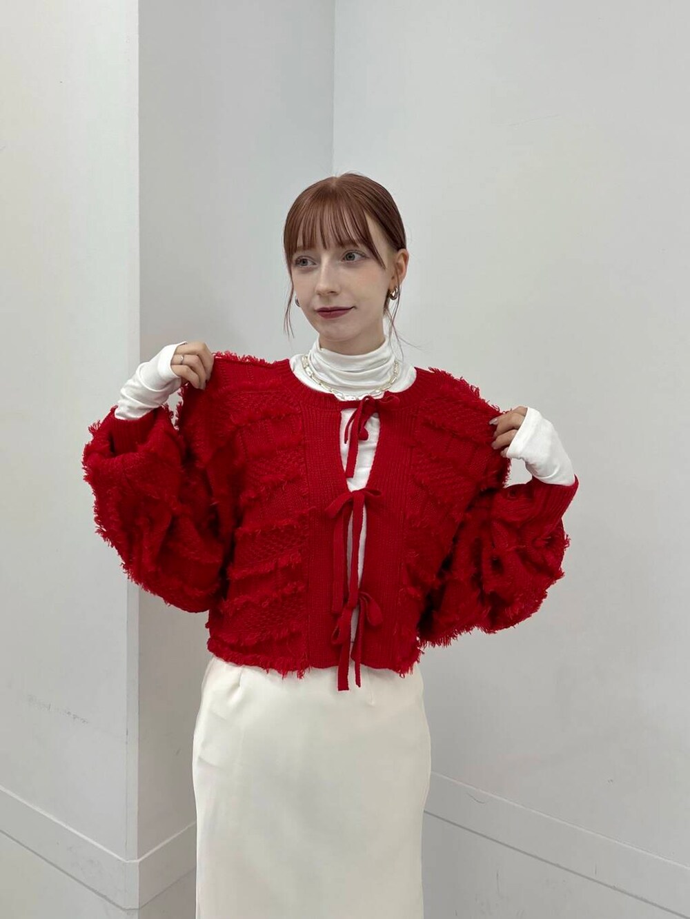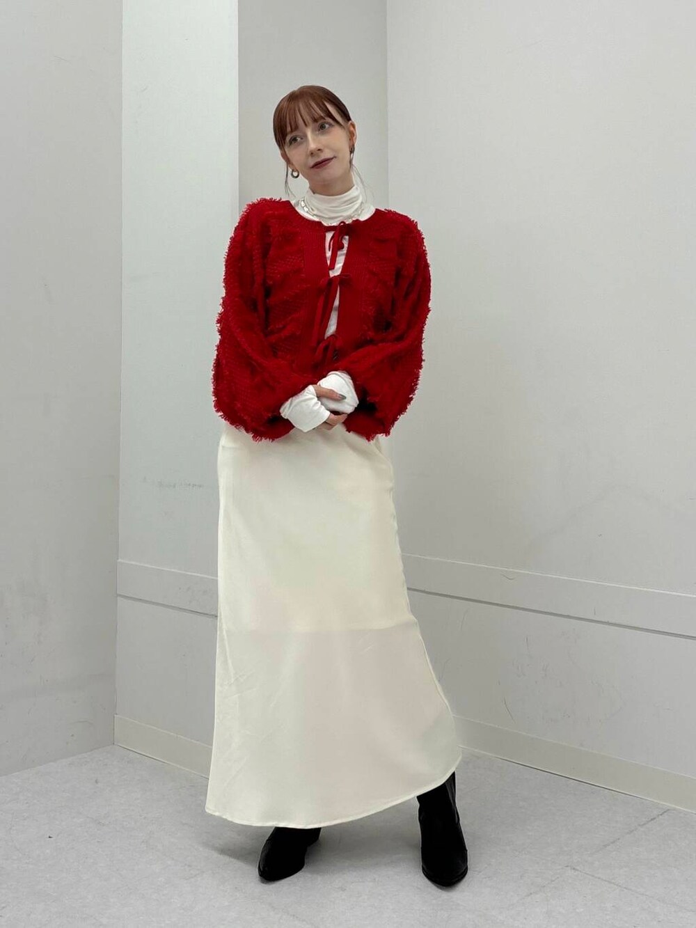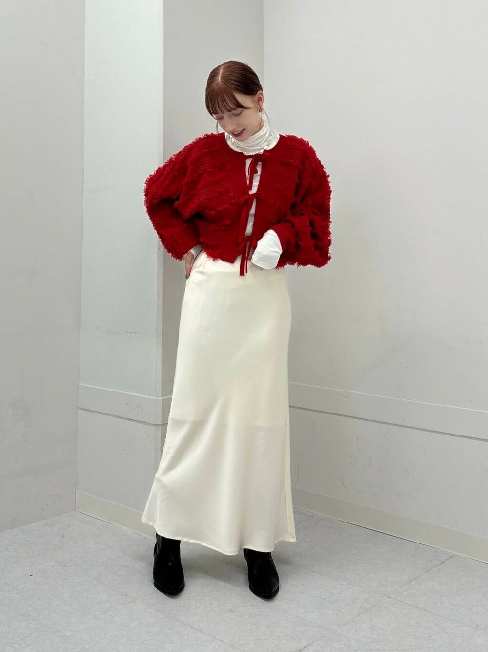 白で統一した中に赤ニットを加えることでさらに色味を映えさせてみました!リボンデザインやサテンの生地などで、女性らしさも演出できます🎀