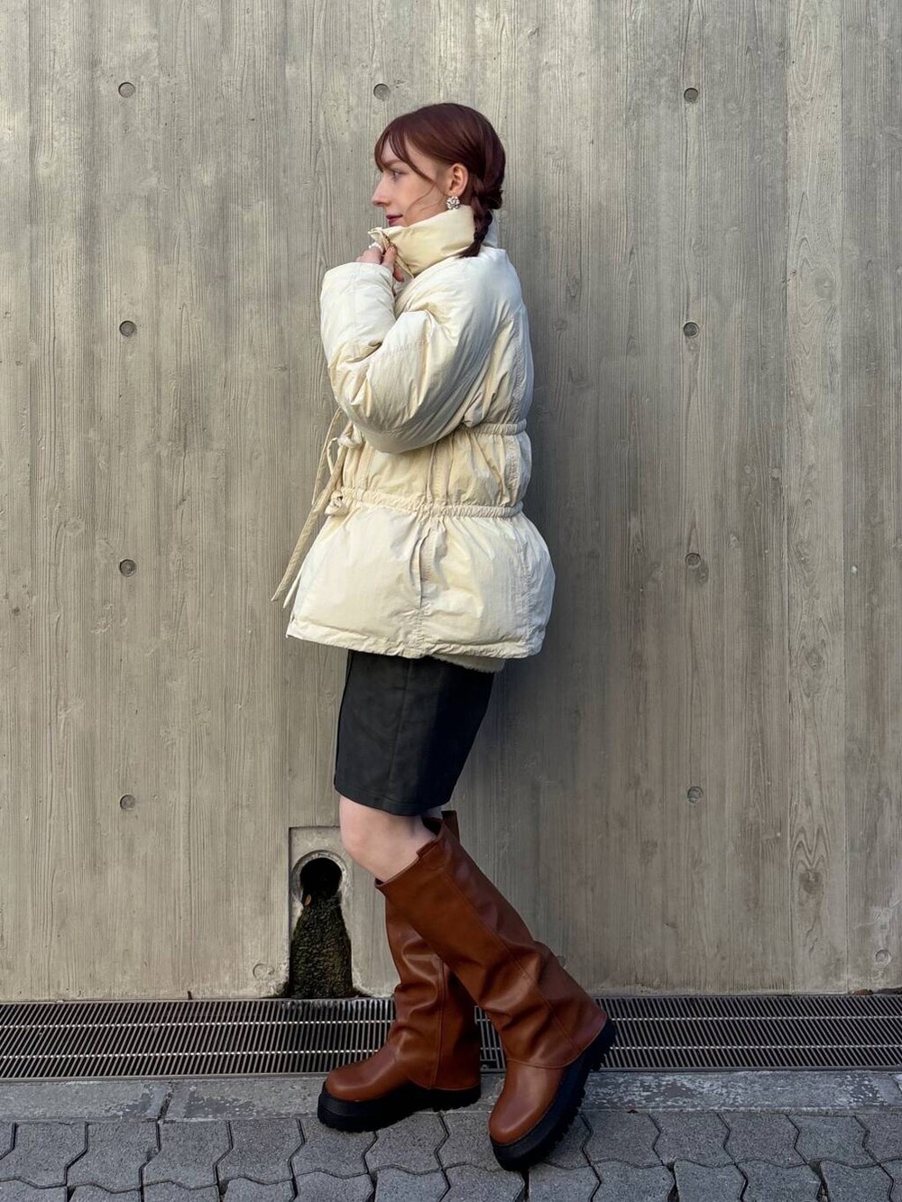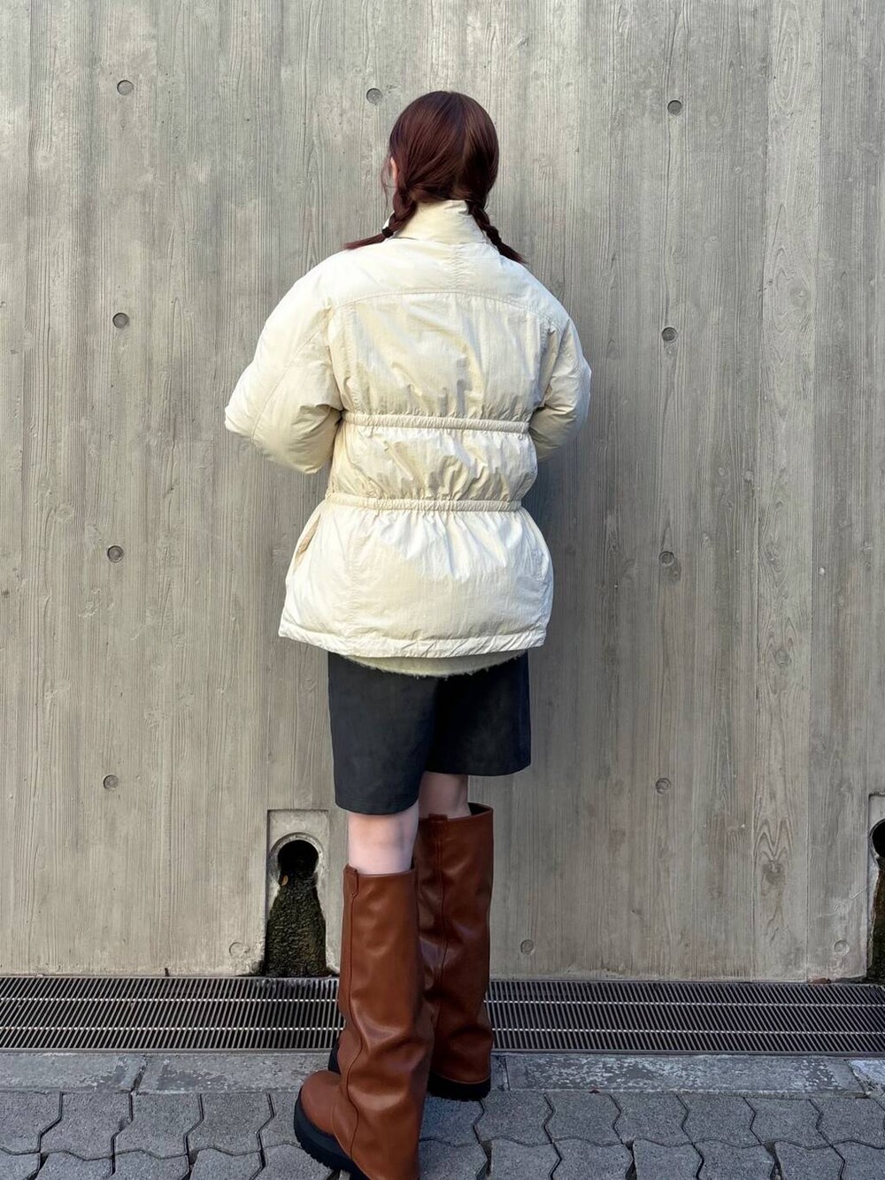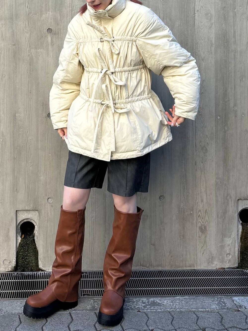 リボンの可愛さを存分に出してくれるアイボリーに、ブラウンのブーツ合わせで足元も可愛く✨