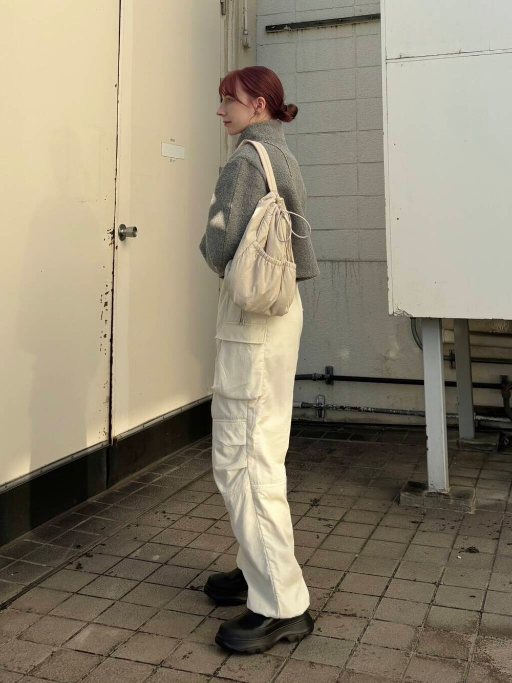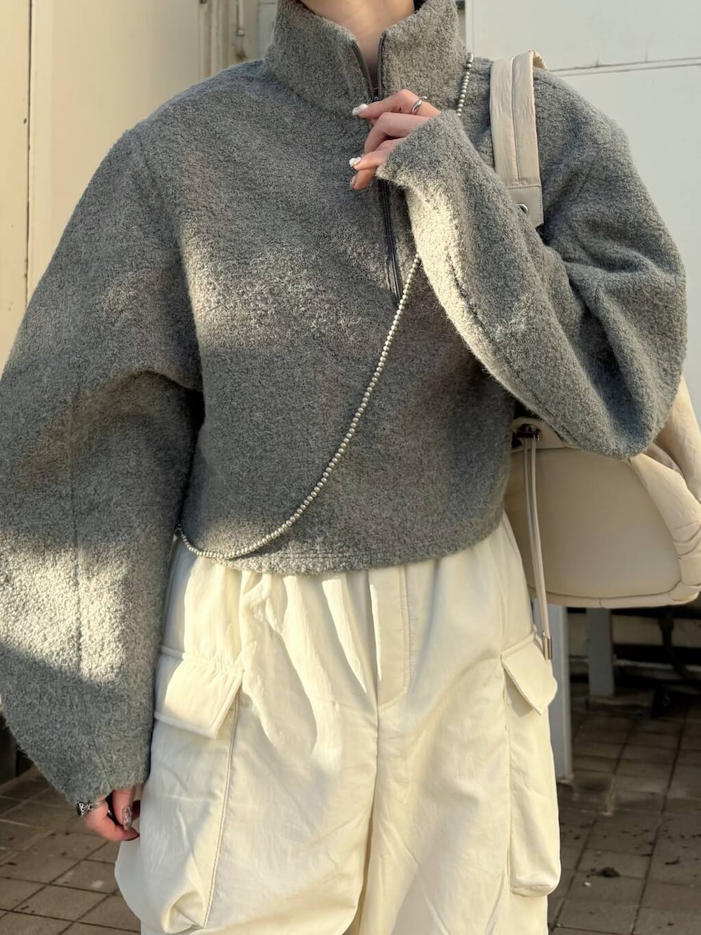 ハーフジップのニットはとても暖かい素材になっていて、15度以上あればアウターいらずで着ていただけます!アウターと合わせて中からちらっと首元見えてもかわいいです🟢