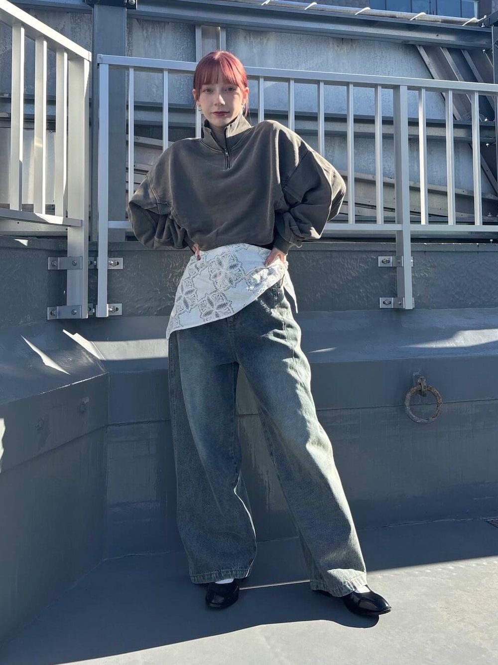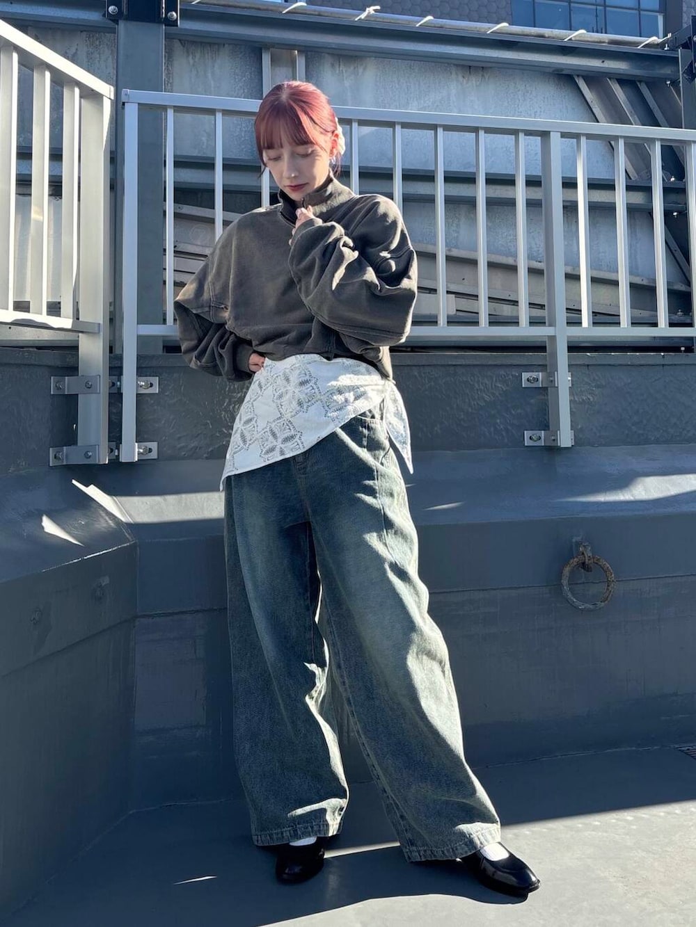 ヴィンテージ感のあるデニムに深みのあるスウェットを合わせてみました!レイヤードアイテムとしてレースを入れ込むのがトレンドっぽいです🤍