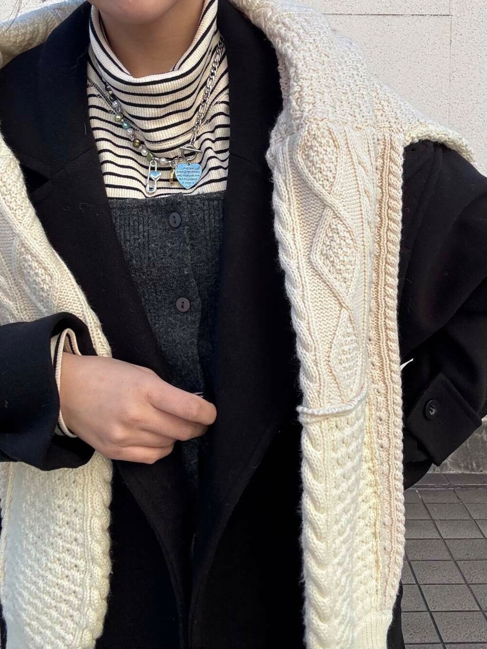 パンツの白と合わせて、パッチワークニットを肩掛けしてみました!