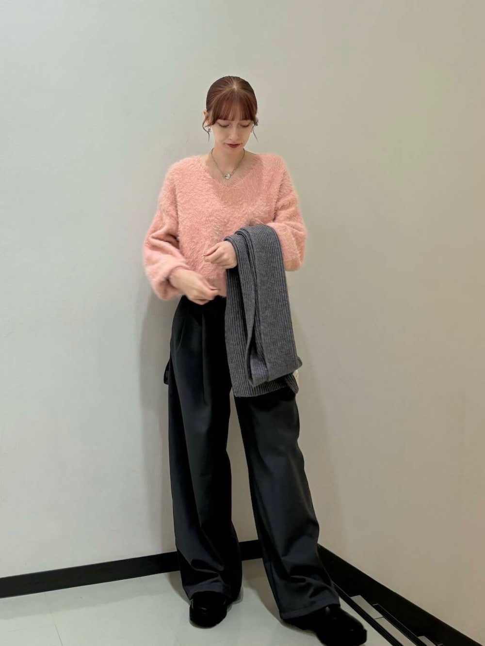 ピンクのシャギーニットでも甘くなりすぎないようにペインタースラックスに落ち着いたグレーのマフラーを合わせてバランスを取っています🧣