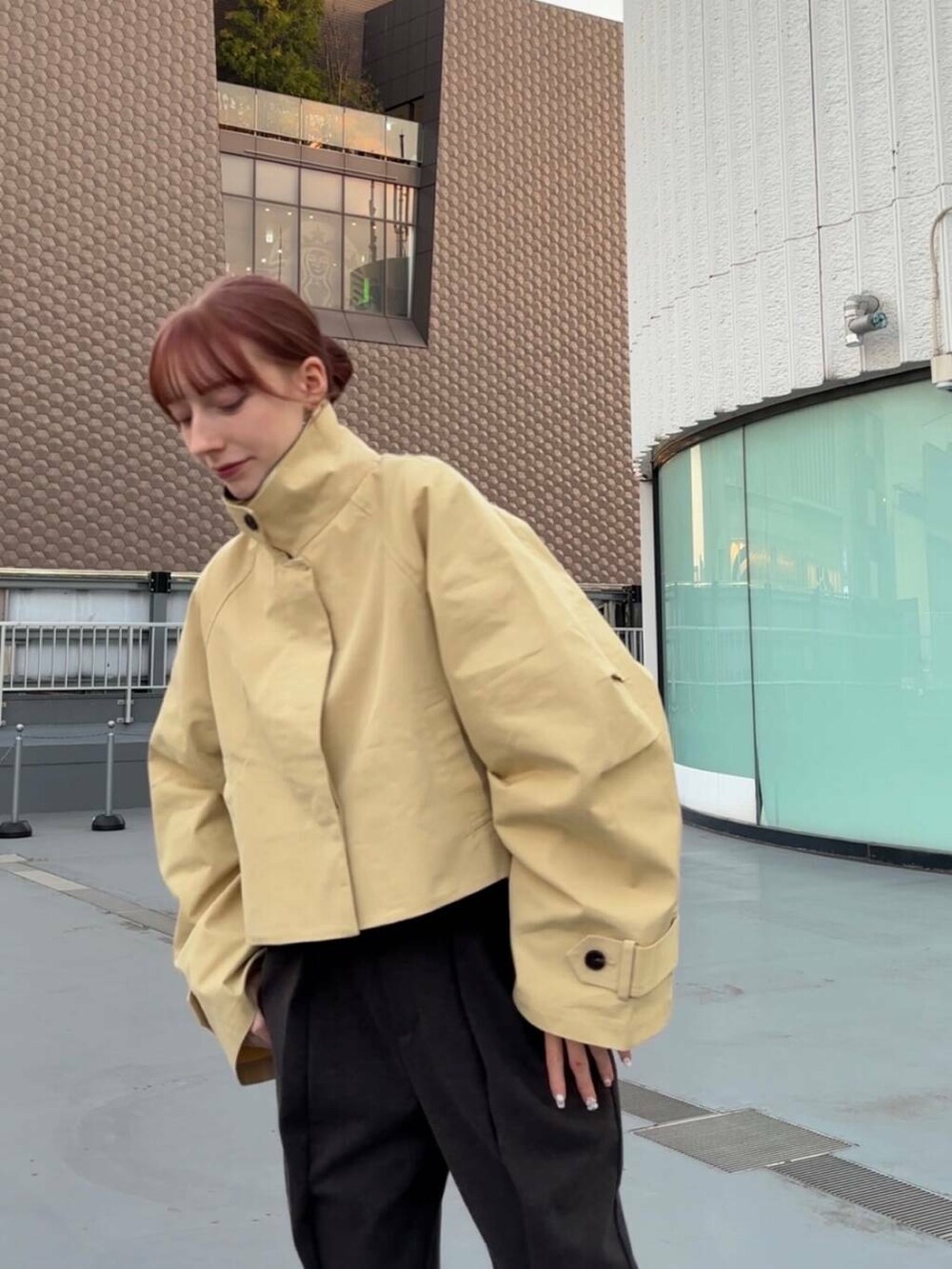 ジャケットは裾口の形も可愛くてスタンドカラーで形も変わるのが嬉しいアイテムです!