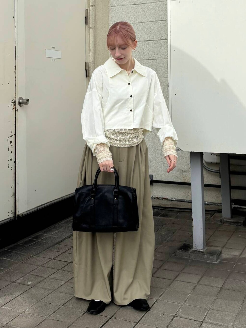 レースをアクセントにインナーとして使って、靴と鞄は黒で合わせて締め色として使っています!