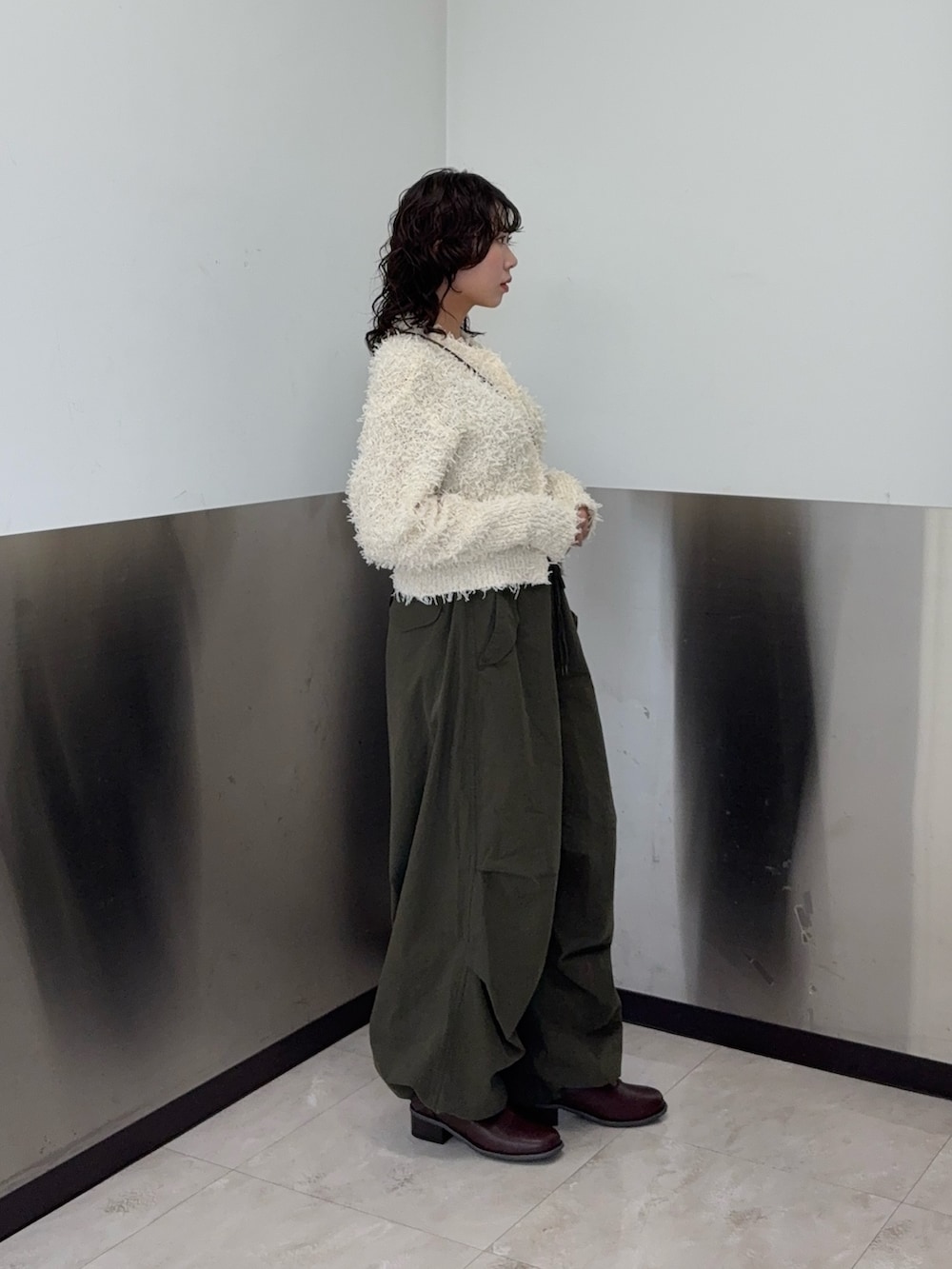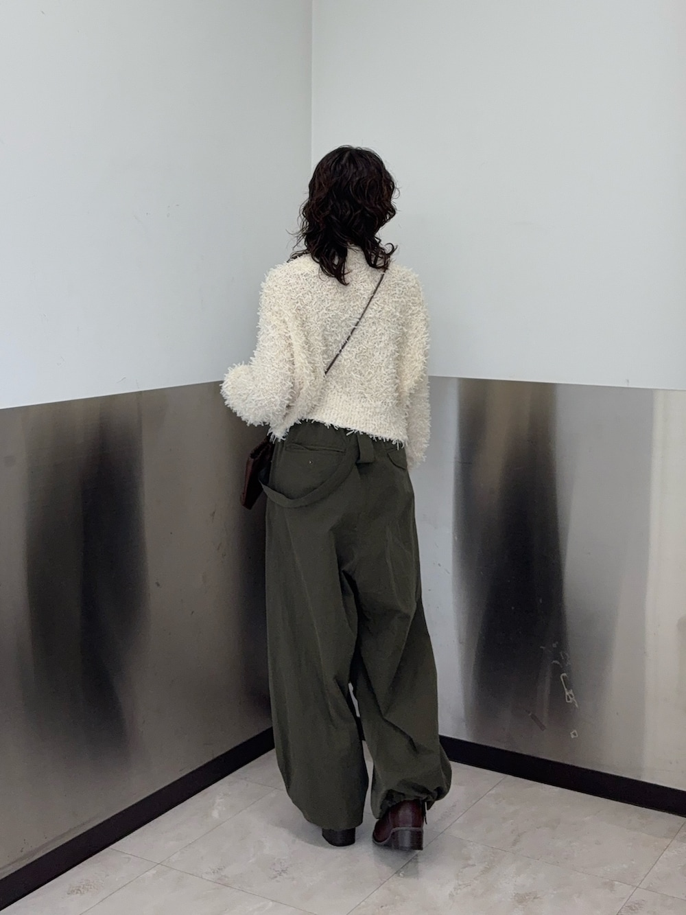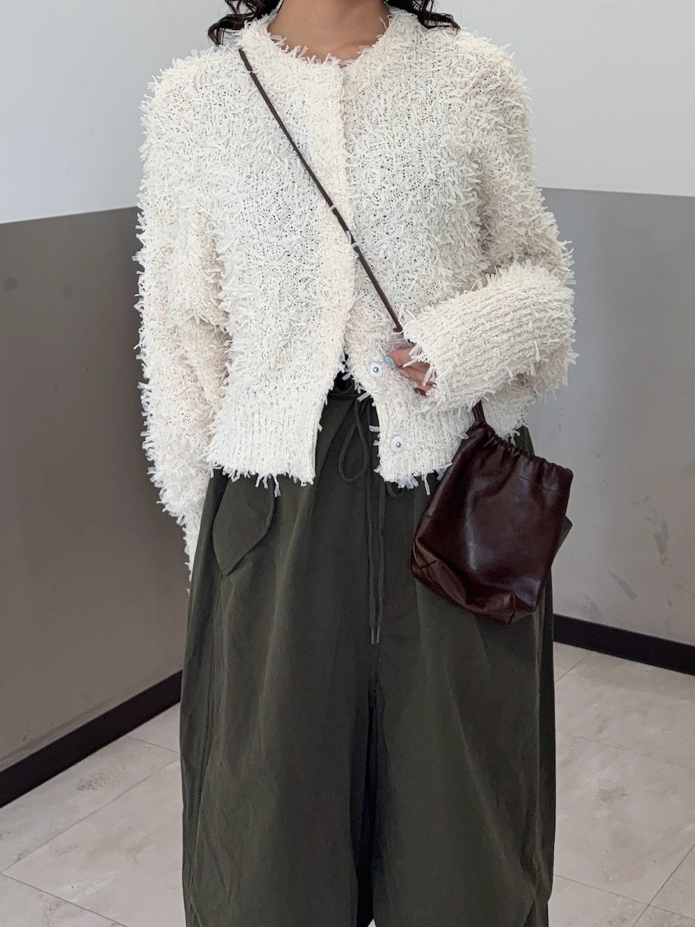 素材感の可愛いカーディガンとワイドなカーゴパンツを合わせてキレイめカジュアルなコーデを組みました✨