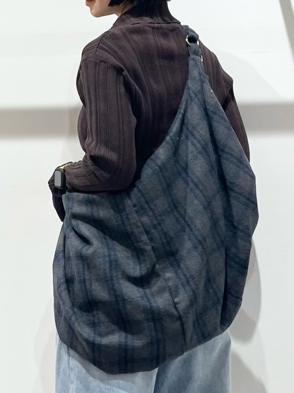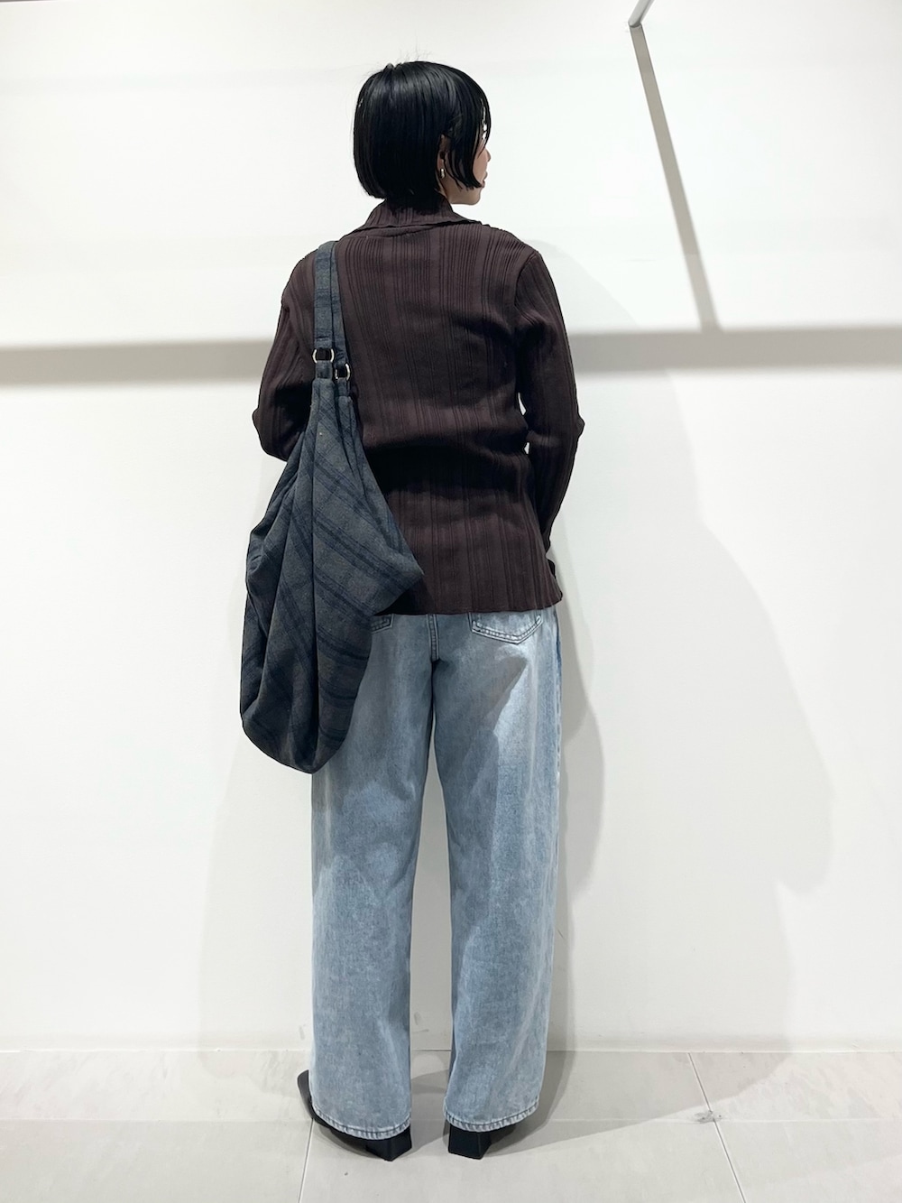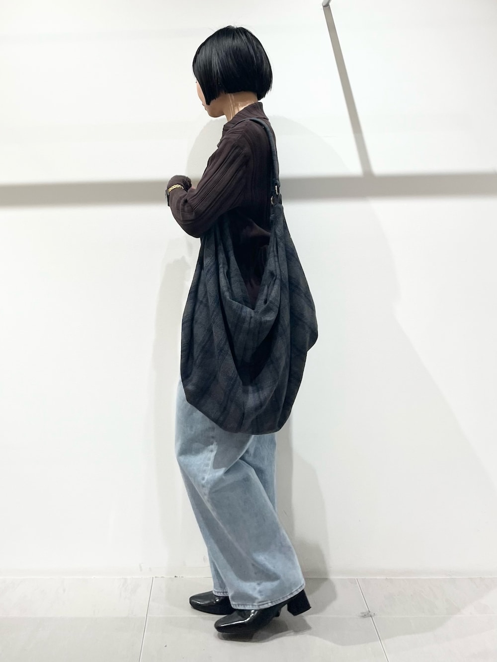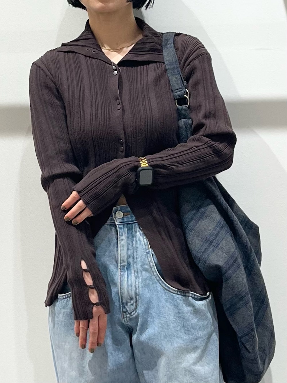 スリットがすっきりとした印象のトップスはアウターを選ばず使いやすいです!ボトムはゆったりとしたデニムにしました。大容量のバッグは長時間のお出かけにぴったりです!