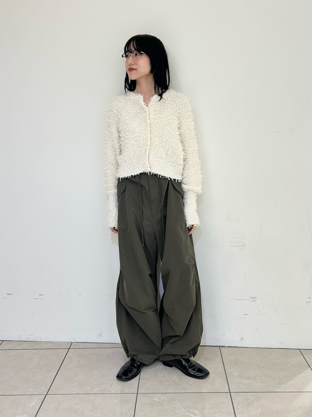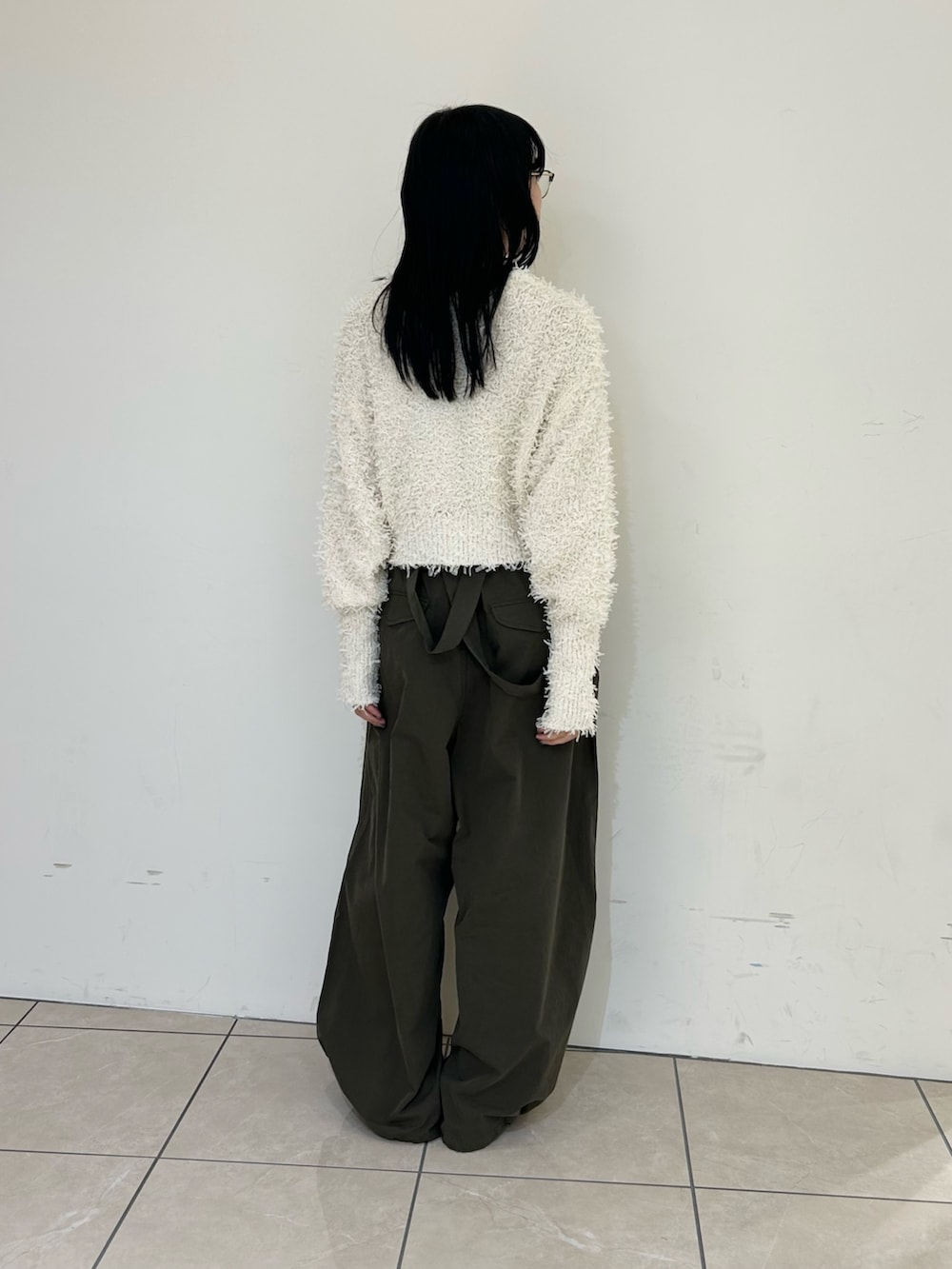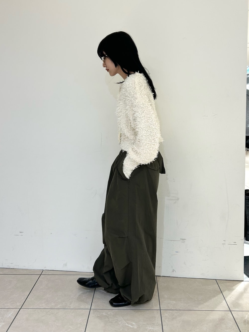 チュールフリンジのニットに、カーゴパンツを合わせてカジュアルなスタイルにしてみました。