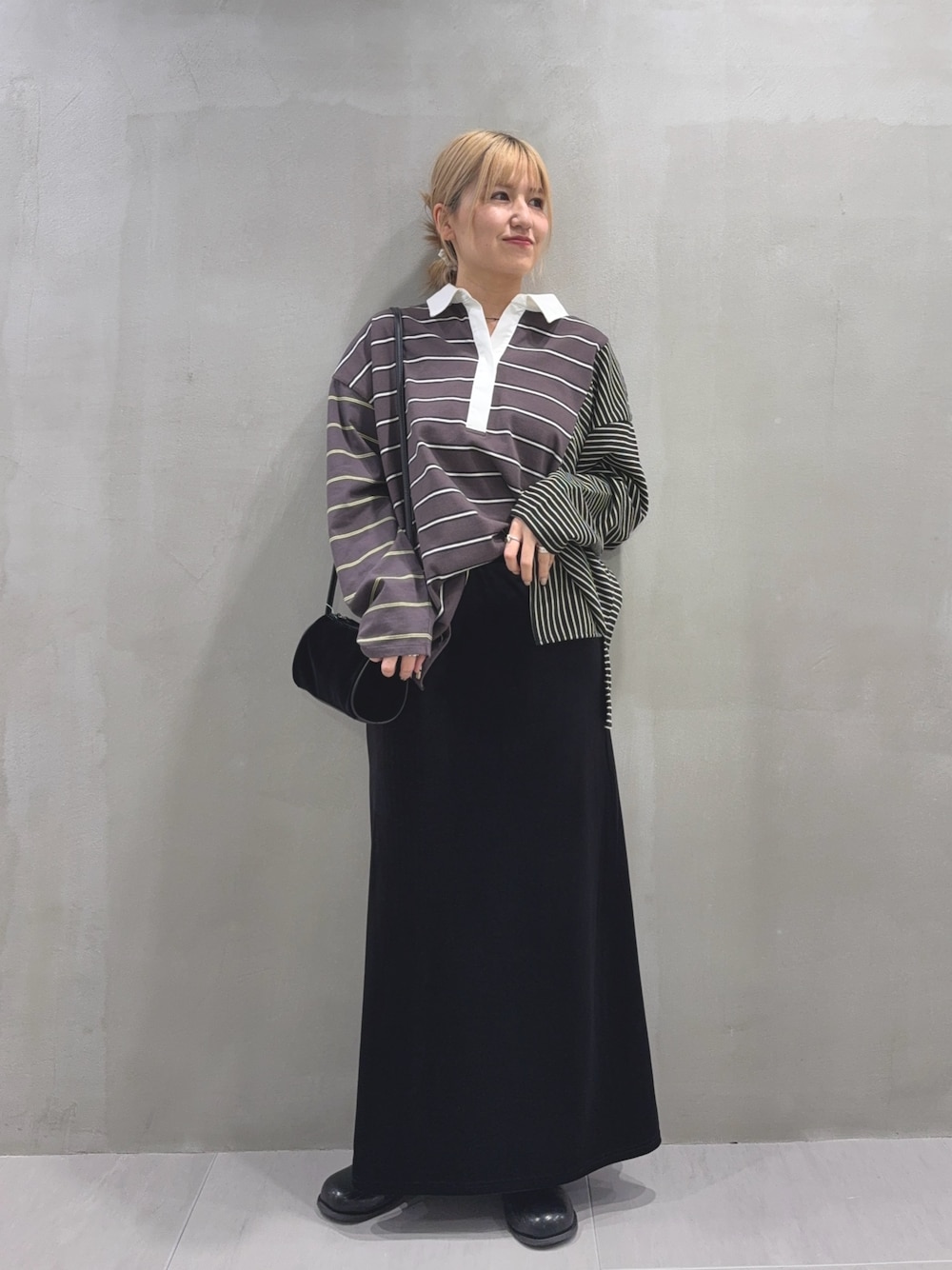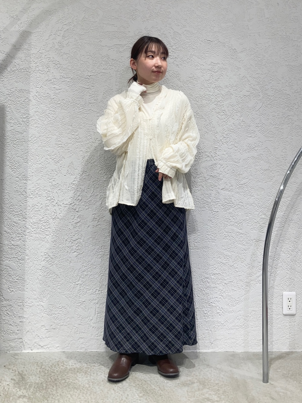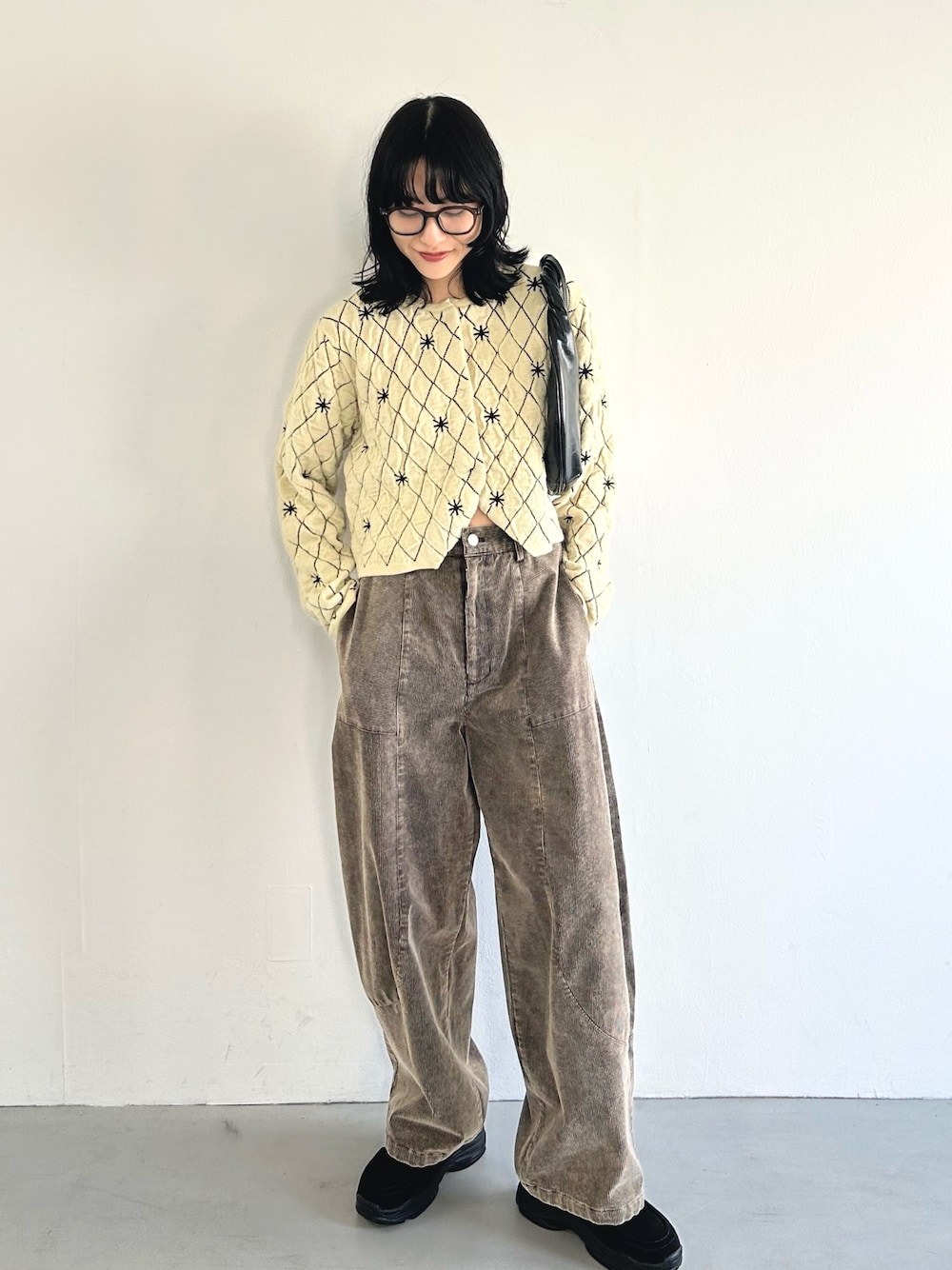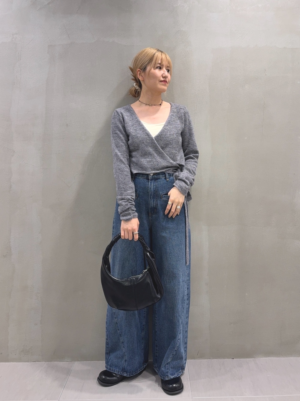 シャツカラーリボンニットに、ドローストリングデニムを合わせて、カジュアルスタイルにしてみました。