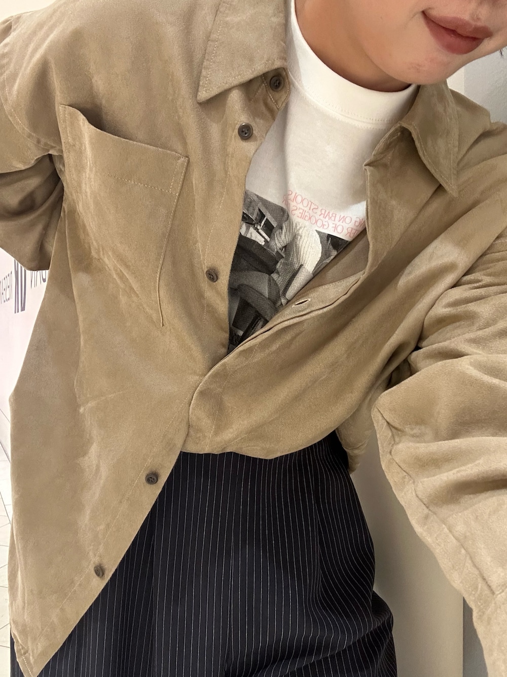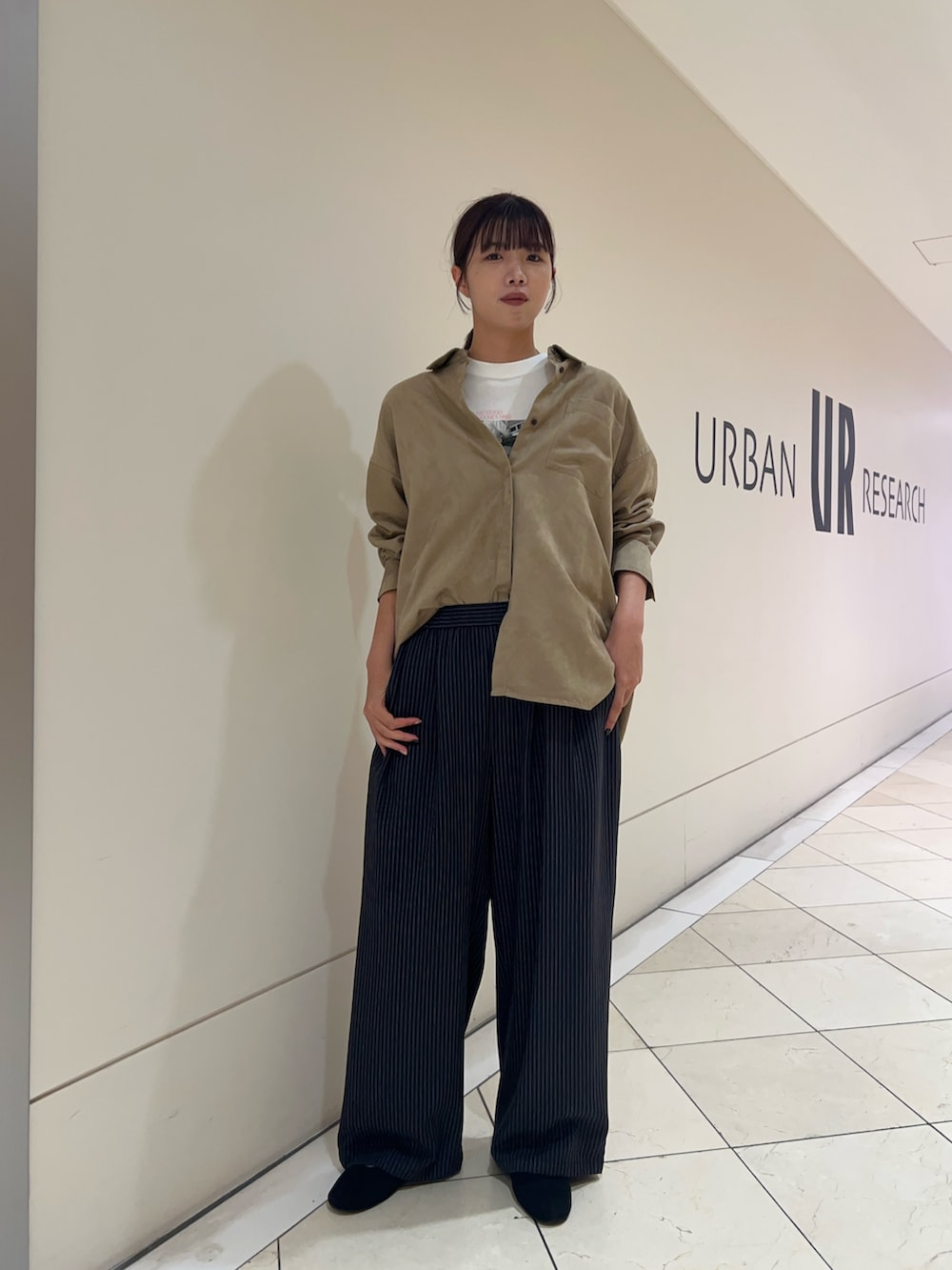 ベージュのシャツに、ストライプのパンツでカジュアルでありつつ大人な秋コーデに!
