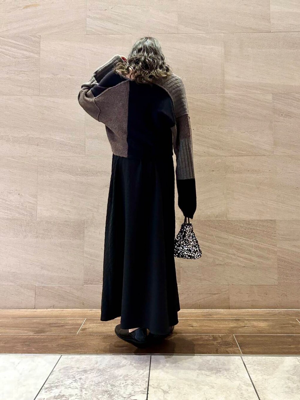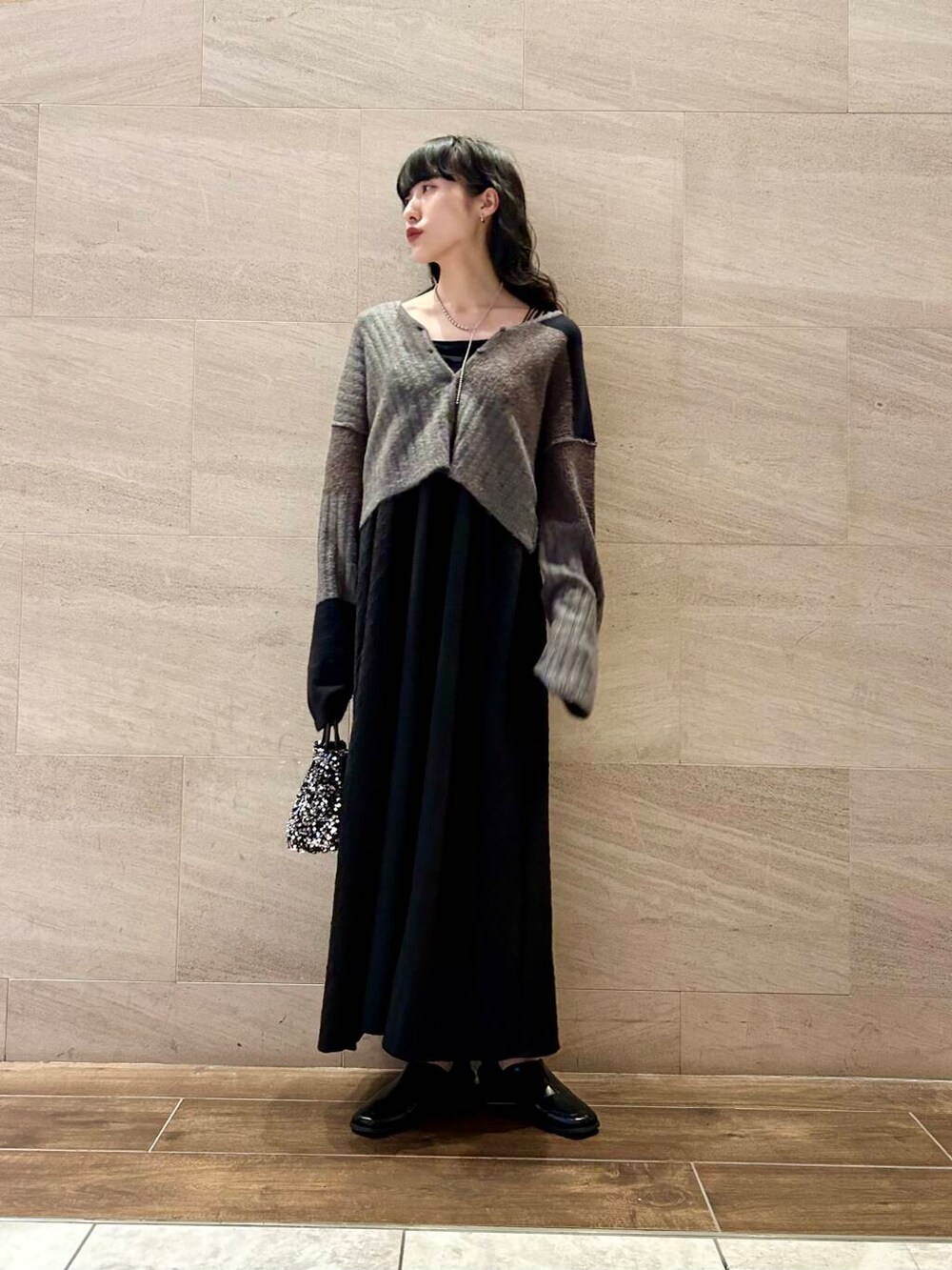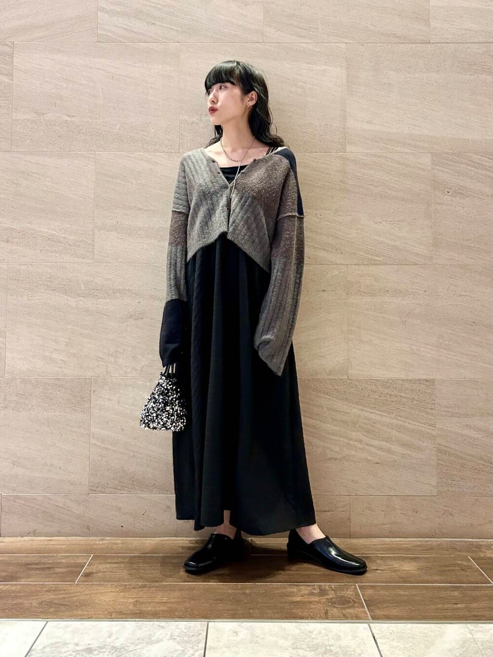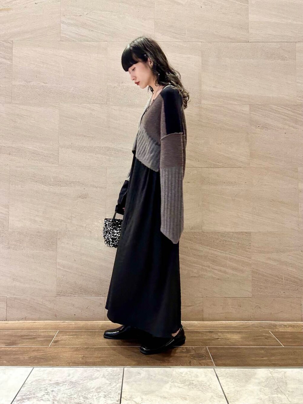 グレーカラーのパッチワークニットカーディガンをメインに、ブラックのキャミワンピースと合わせてみました。
