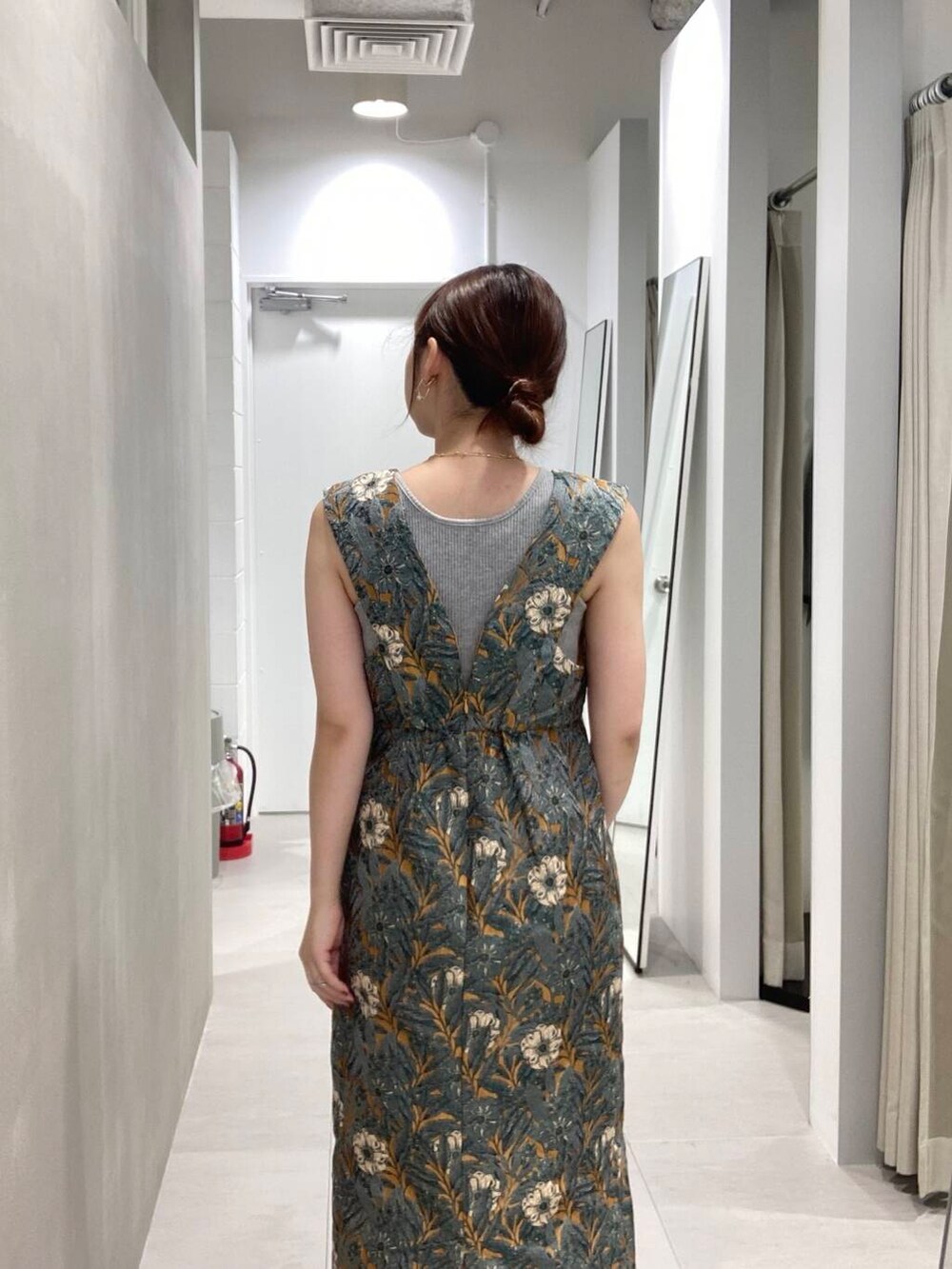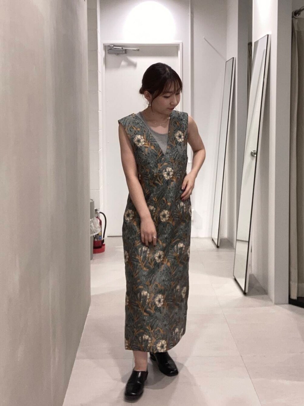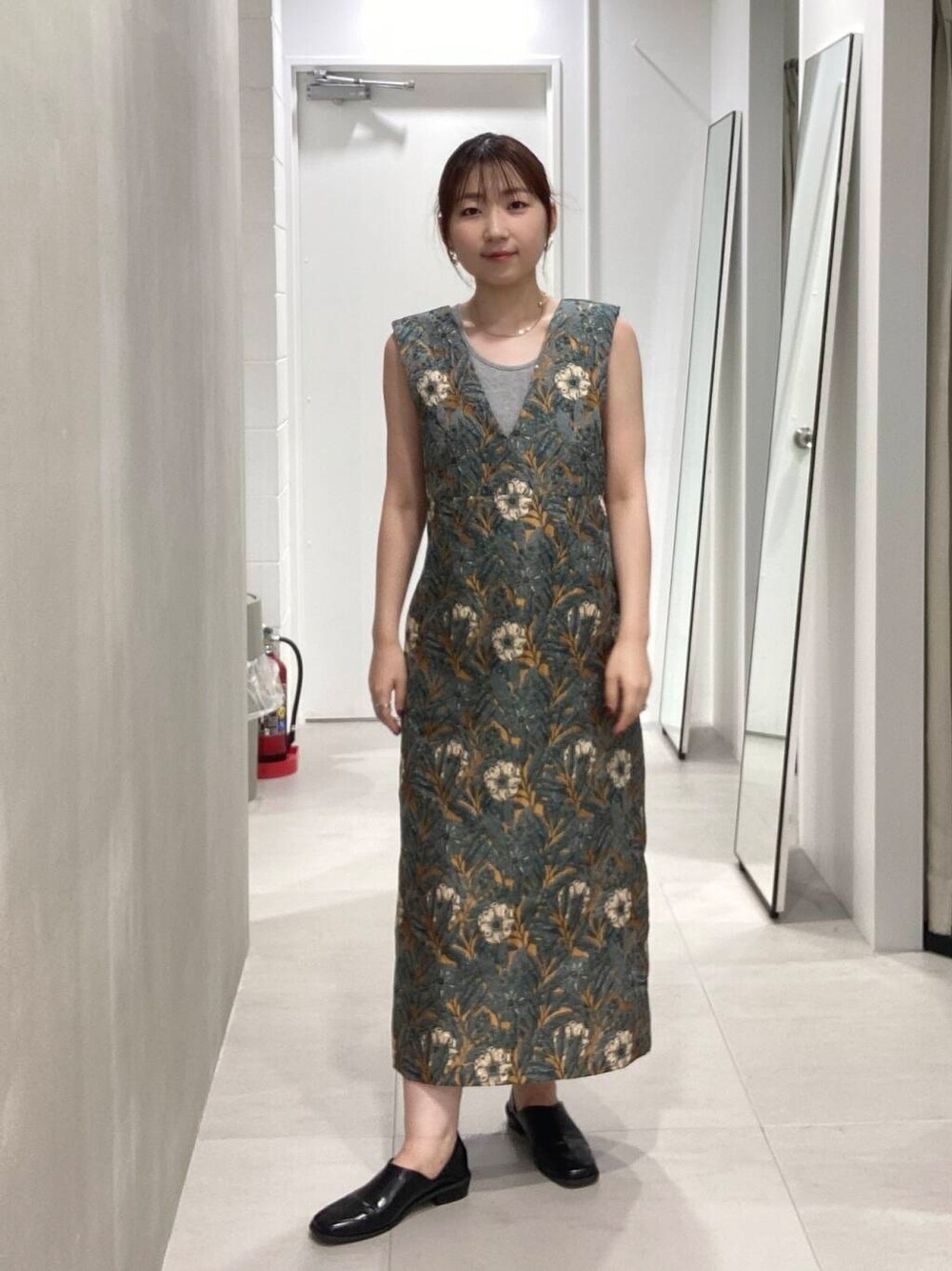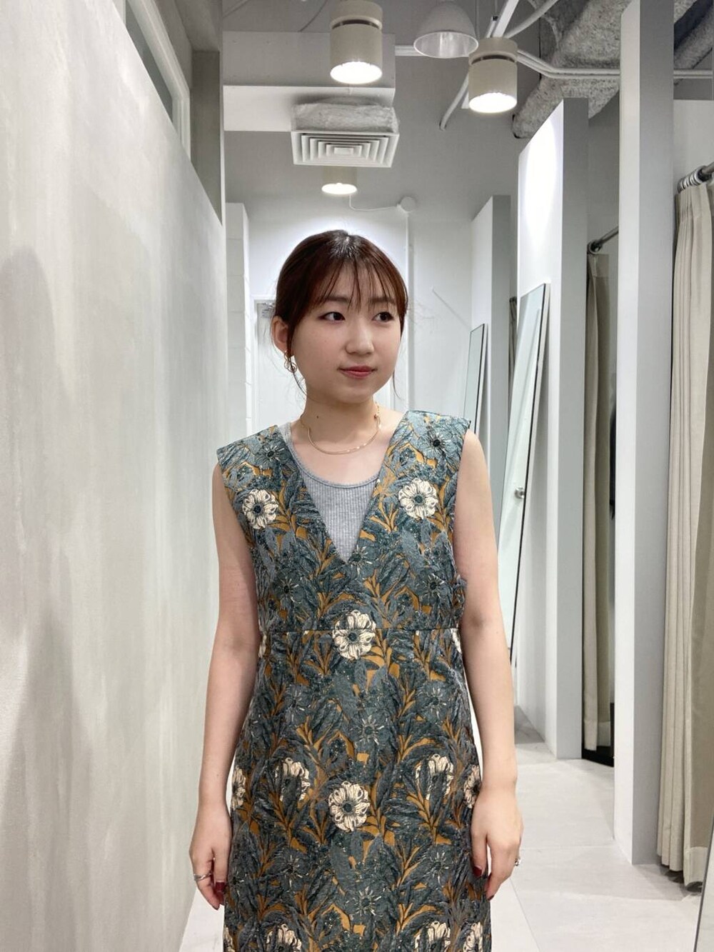 深めのVネックなので、アクセサリーも映えるワンピースです。