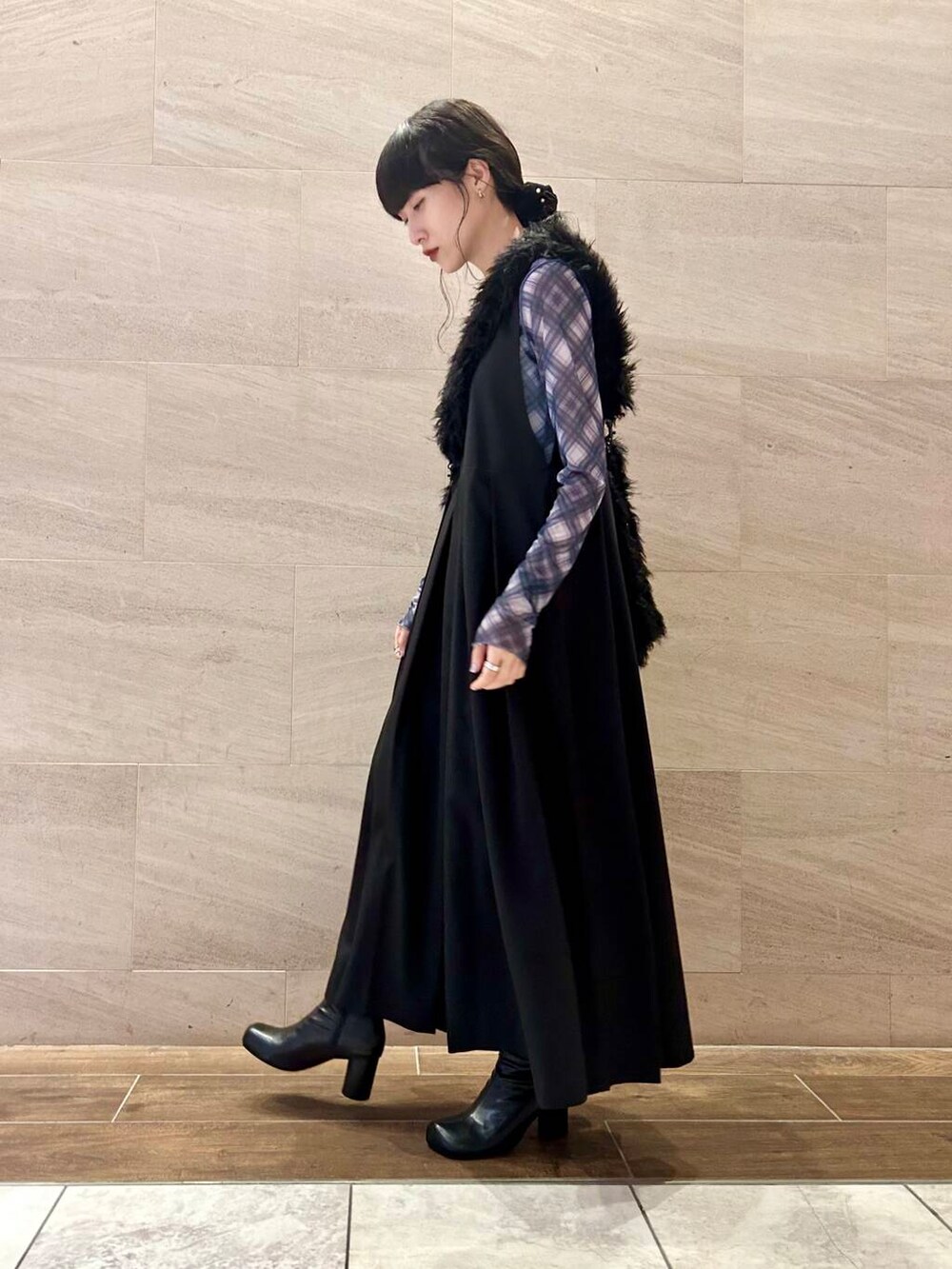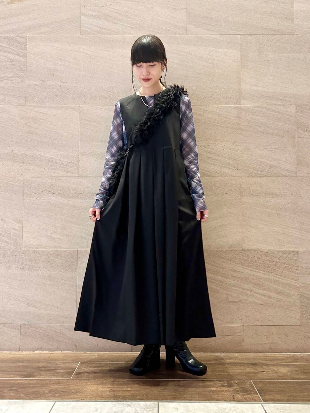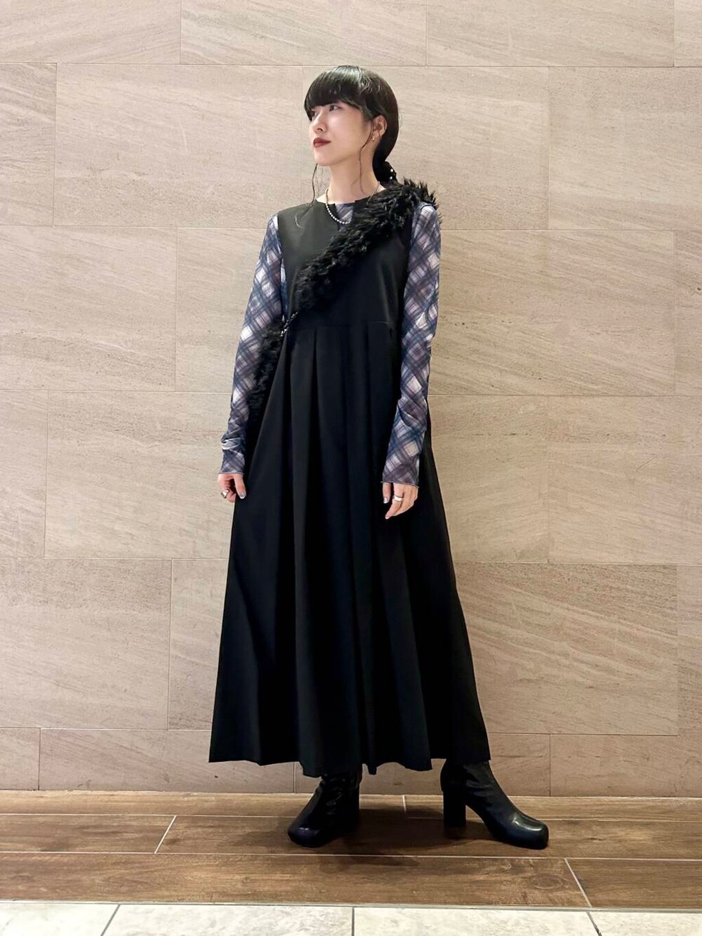 ブラックのBIGプリーツジャンパースカートに、ブルーチェックのシアーメロートップスを合わせてみました。