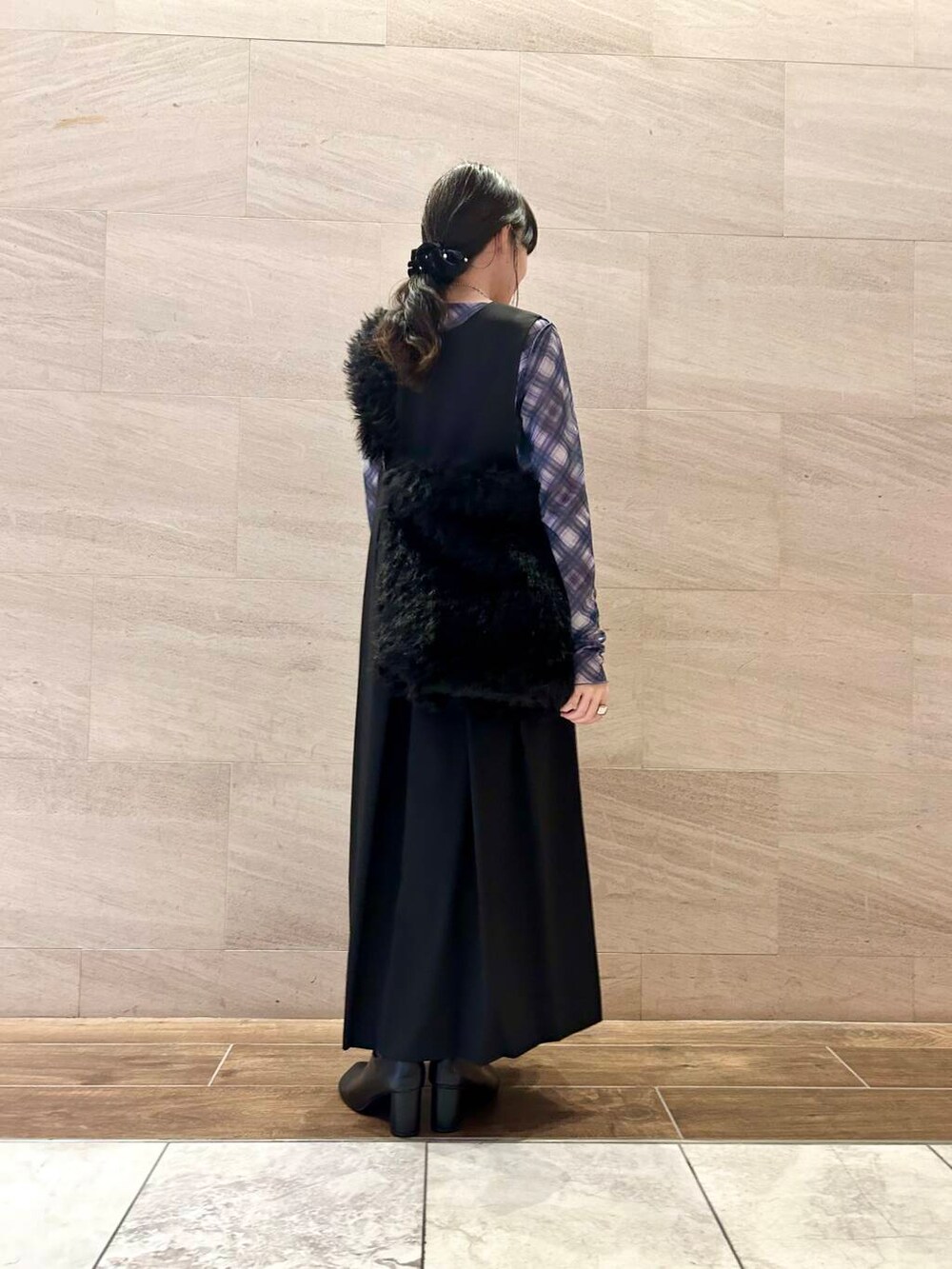 ポイントにブラックのファーバッグをプラス。