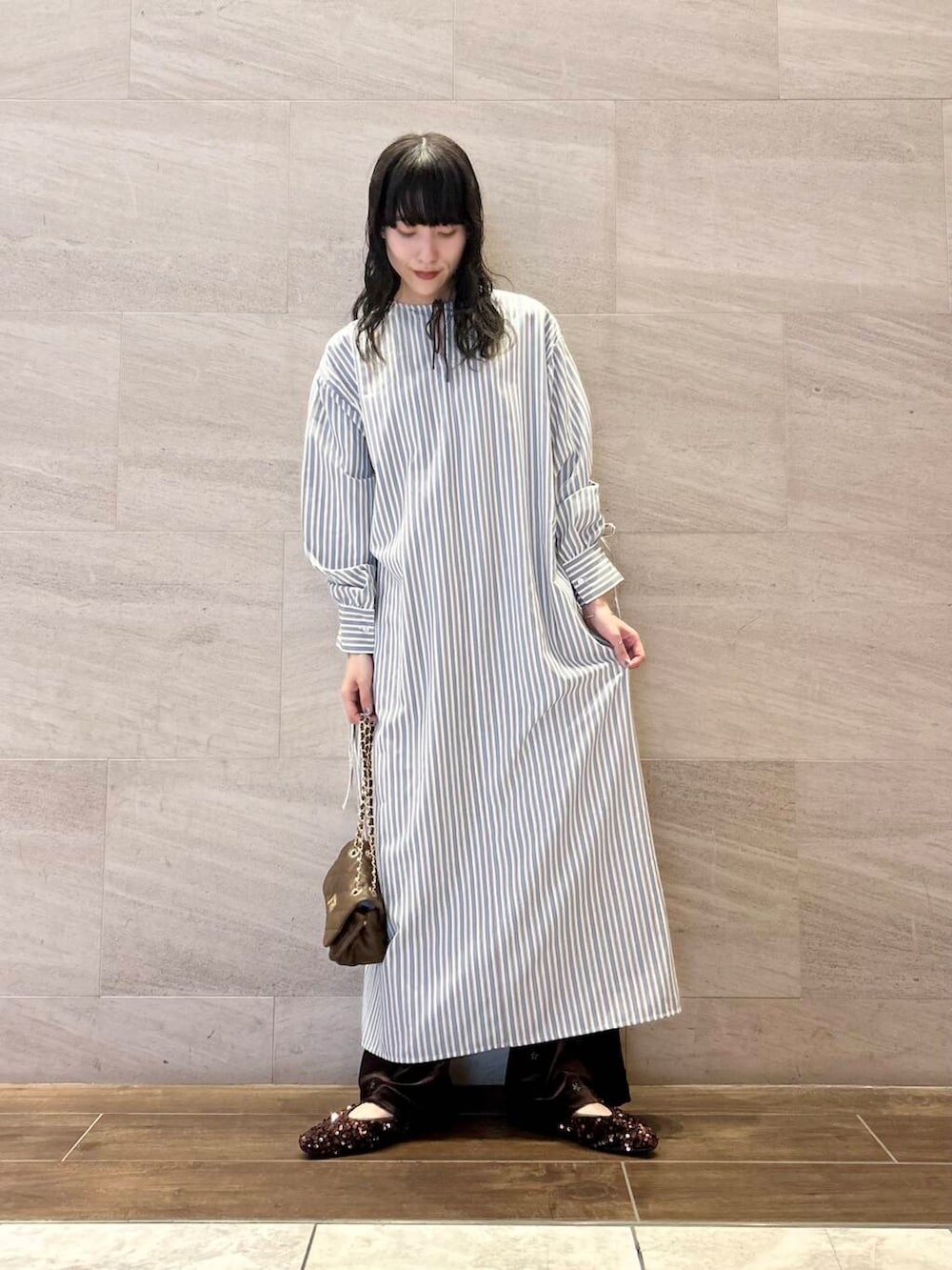 足元はブラウンのスパンコールミュールで大人っぽく。