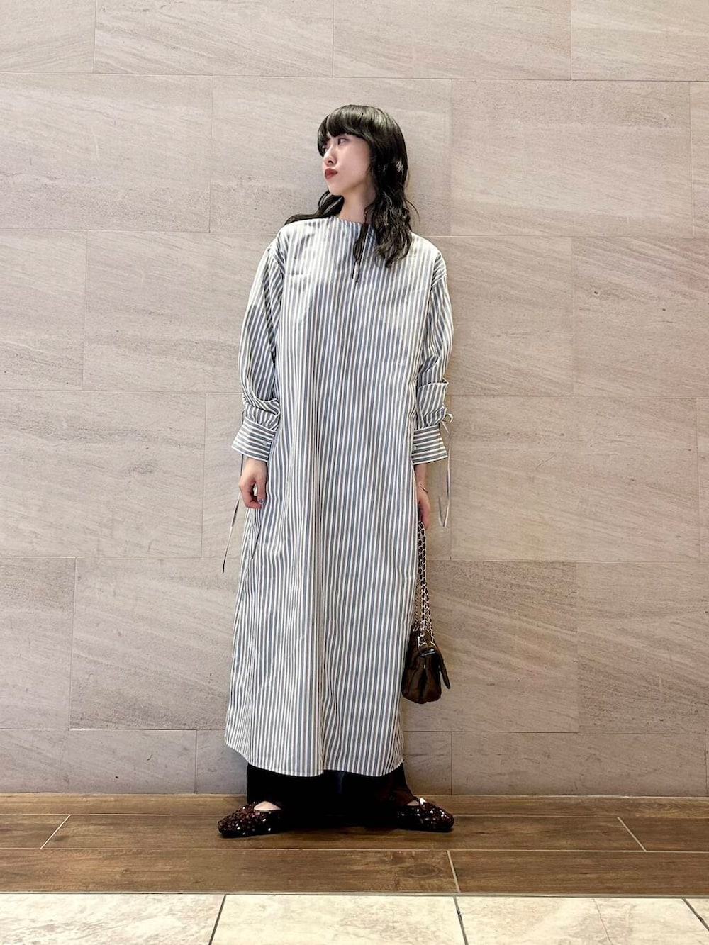 ポイントにブラウンのチェーンバッグをプラス。