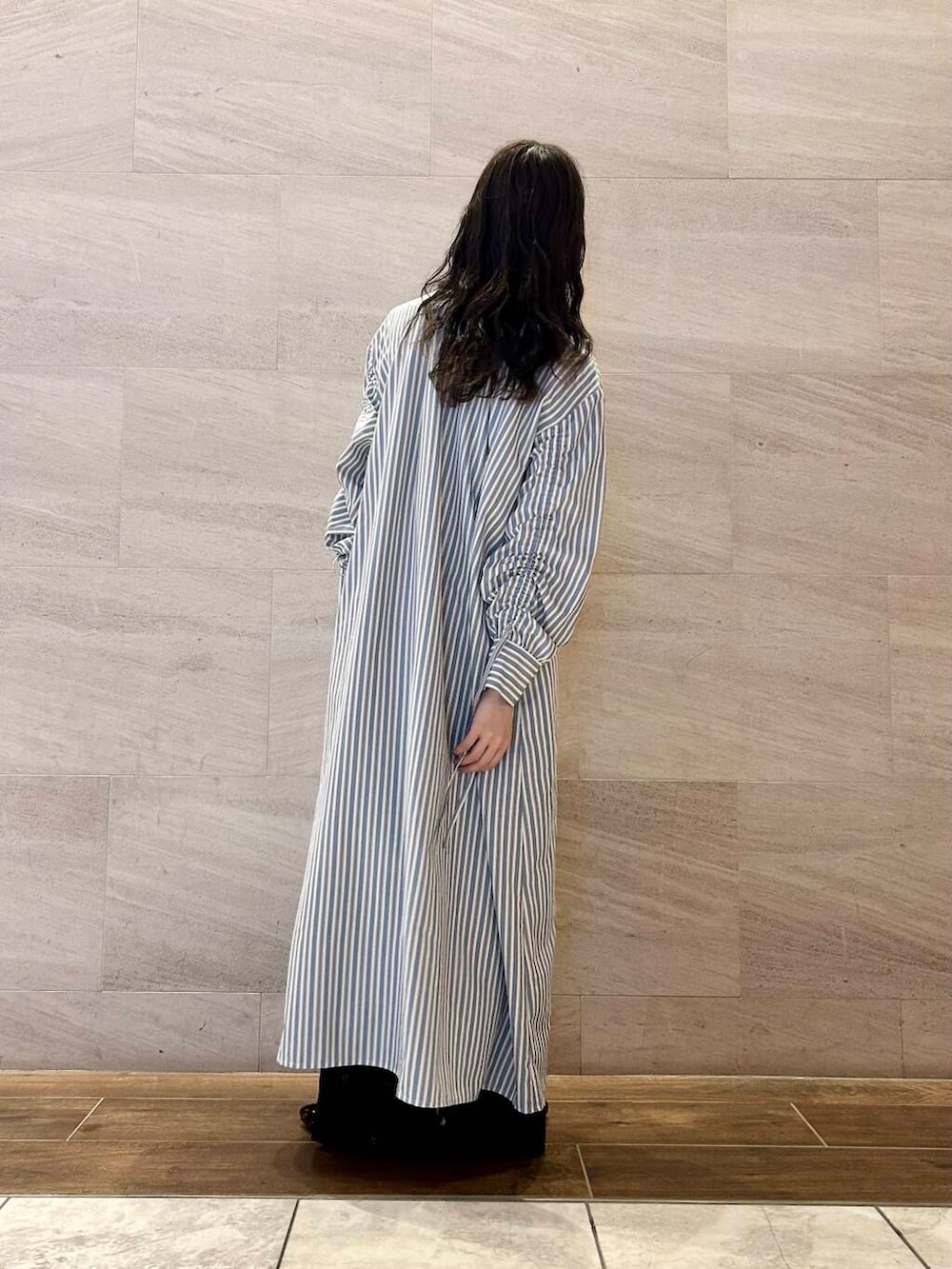 薄めの生地で、着心地もサラッとしたワンピースは、上からオーバーなニットカーディガンを合わせても◎