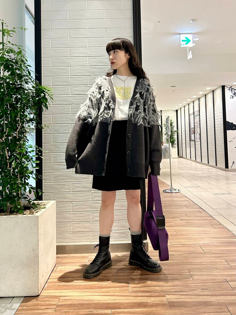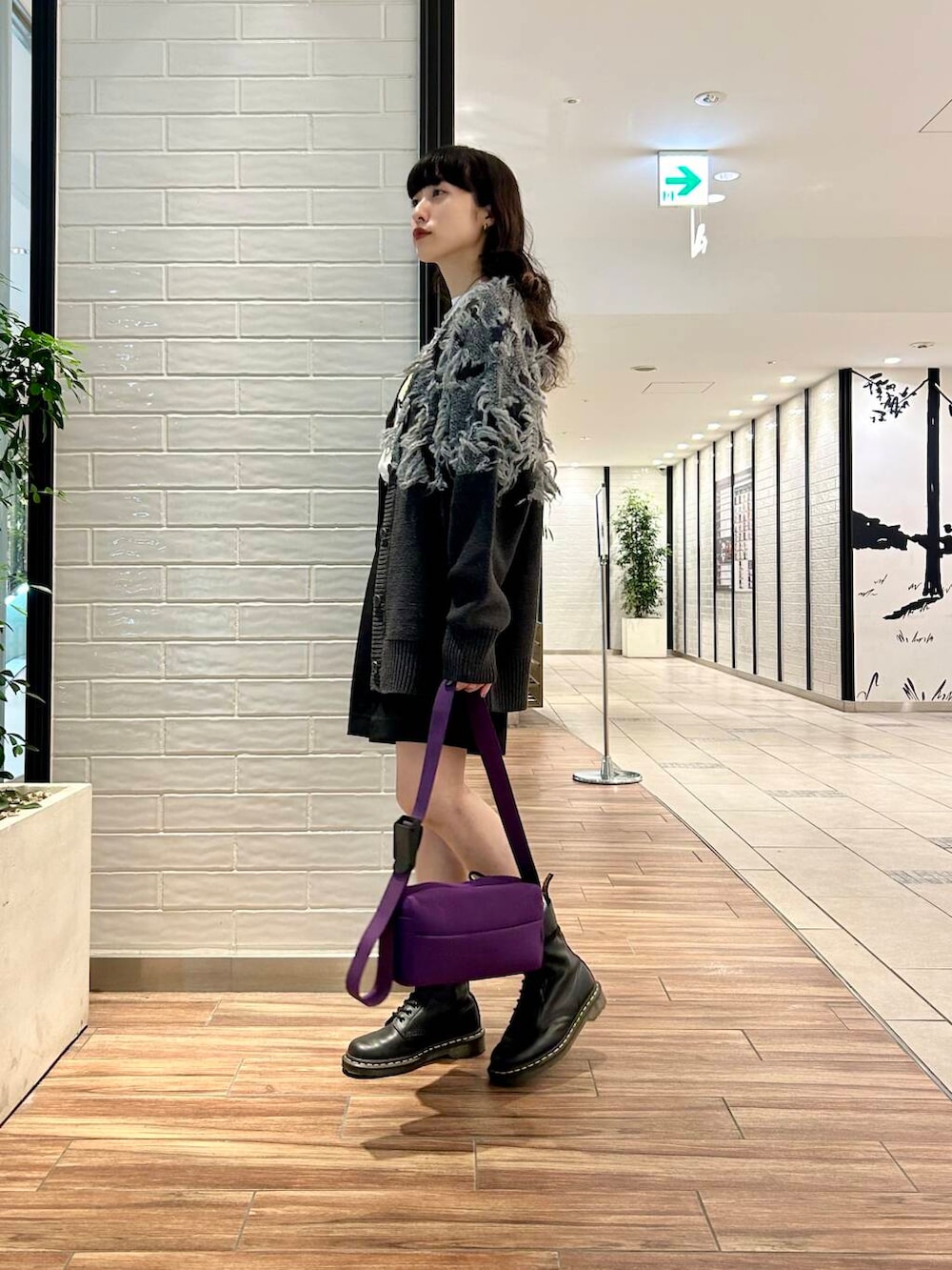 ポイントにパープルカラーのバッグをプラス。