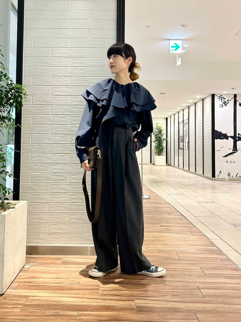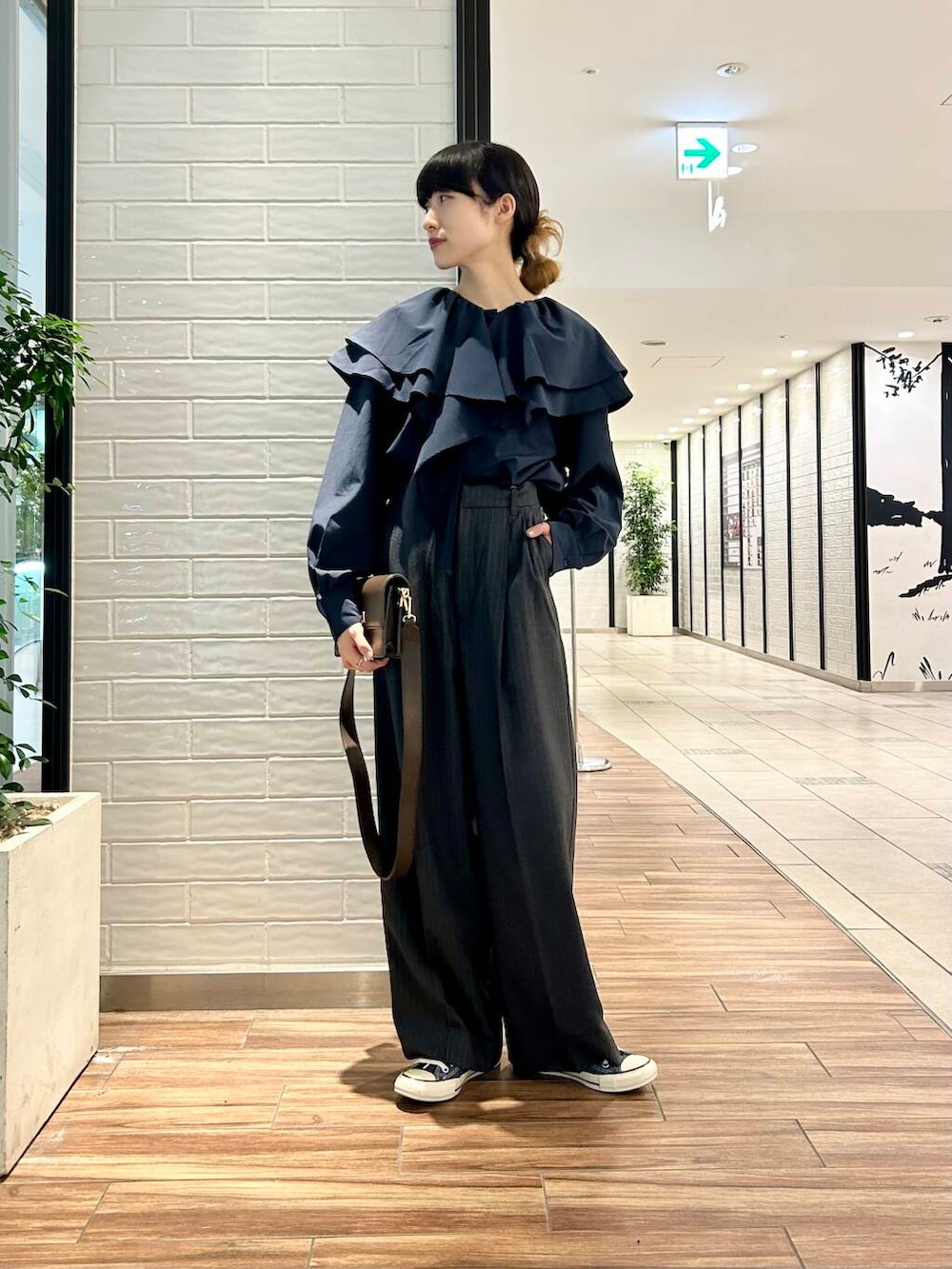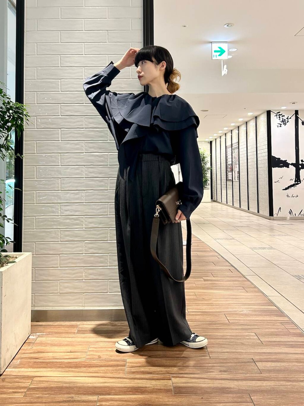 ポイントにブラウンのショルダーバッグをプラス。
