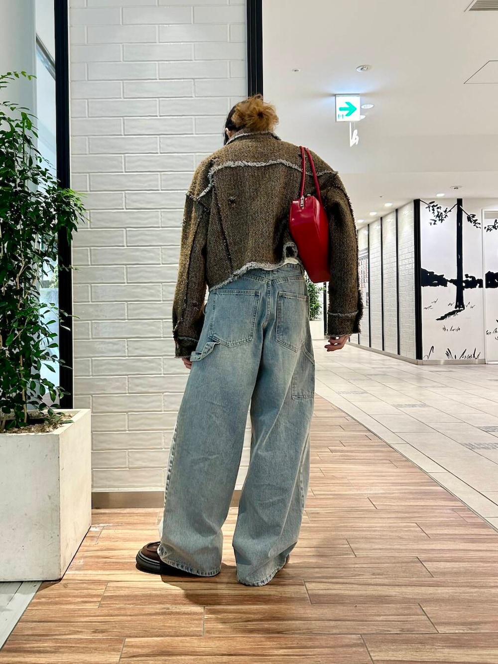 ポイントに赤のショルダーバッグをプラス。