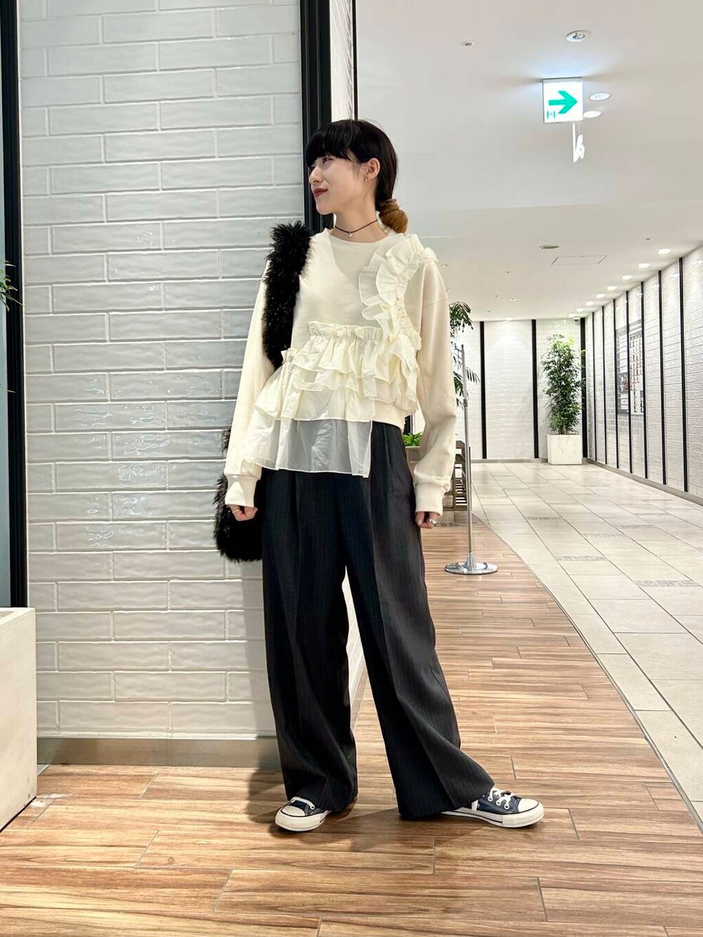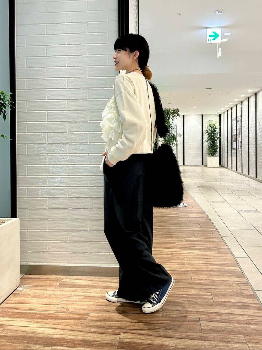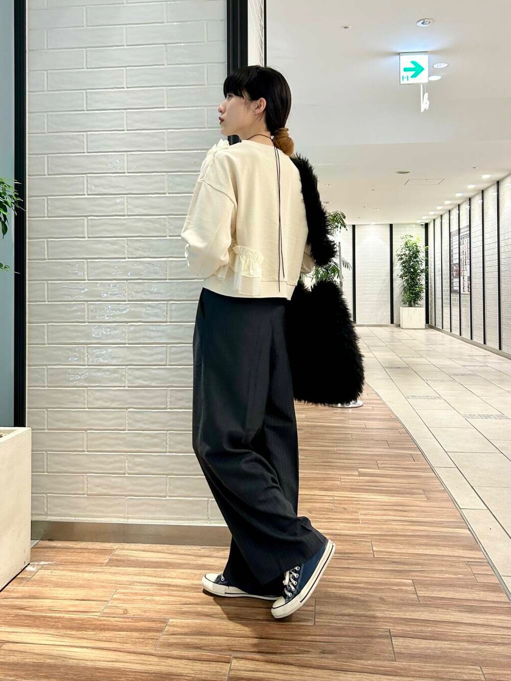 一枚でおしゃれにきまるスウェットは、スカートで綺麗めに合わせても◎