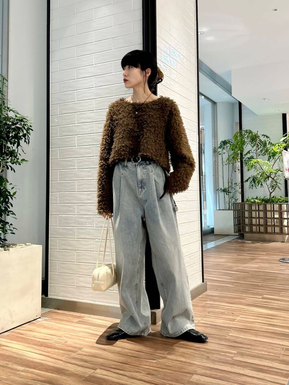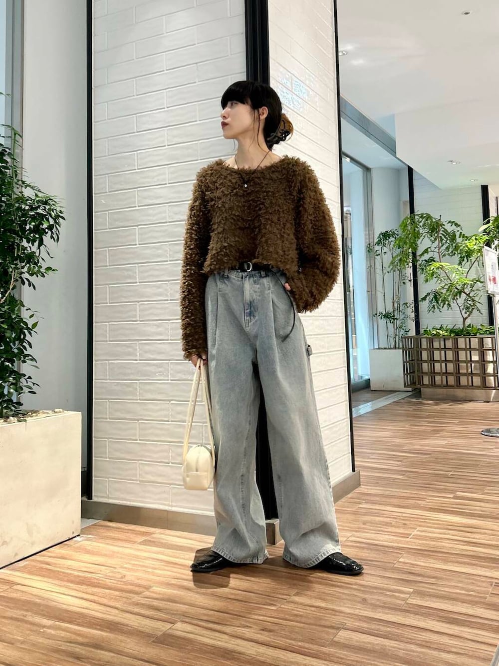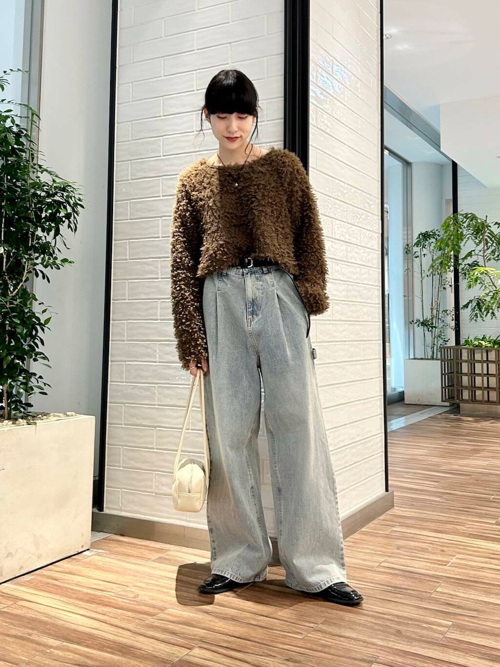 ポイントにアイボリーのショルダーバッグをプラス。