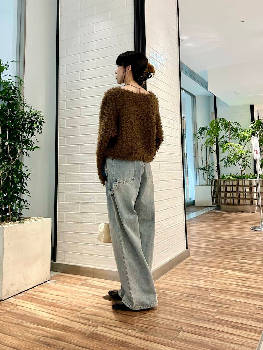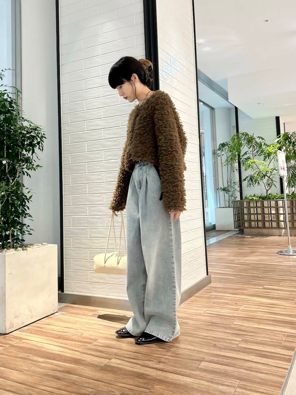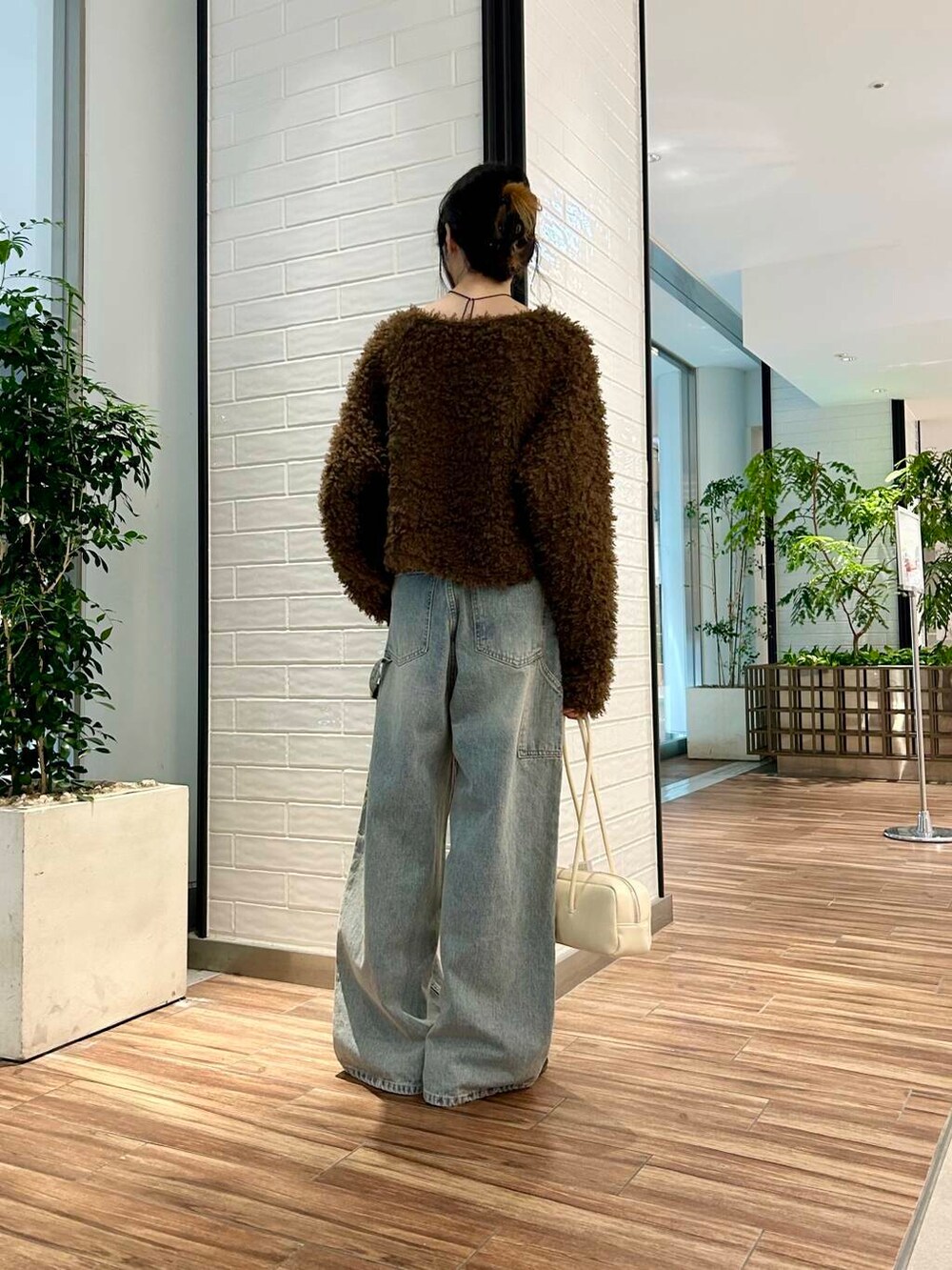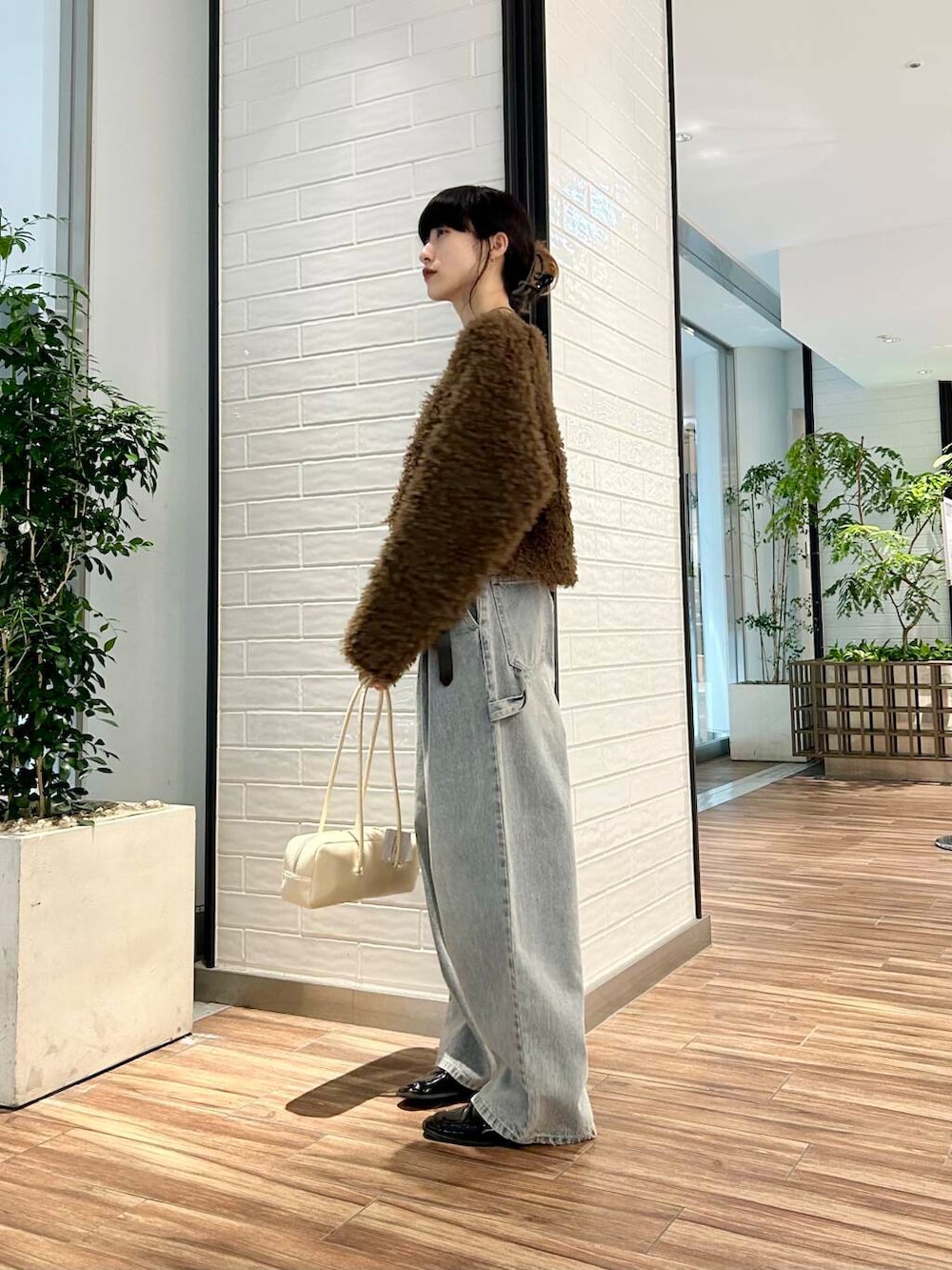 ポイントにアイボリーのショルダーバッグをプラス。