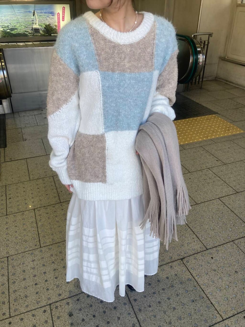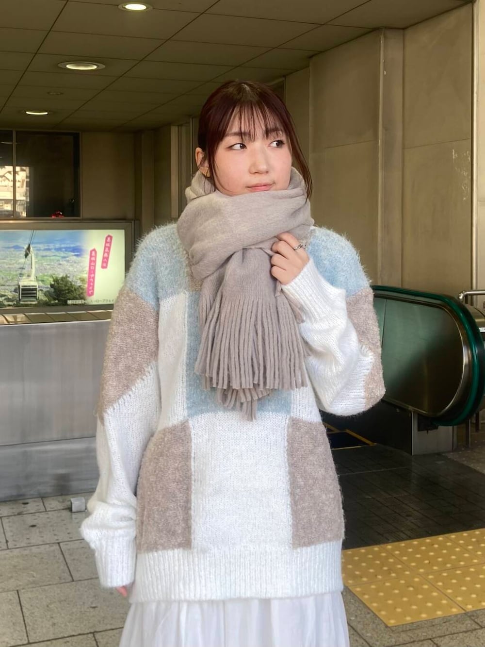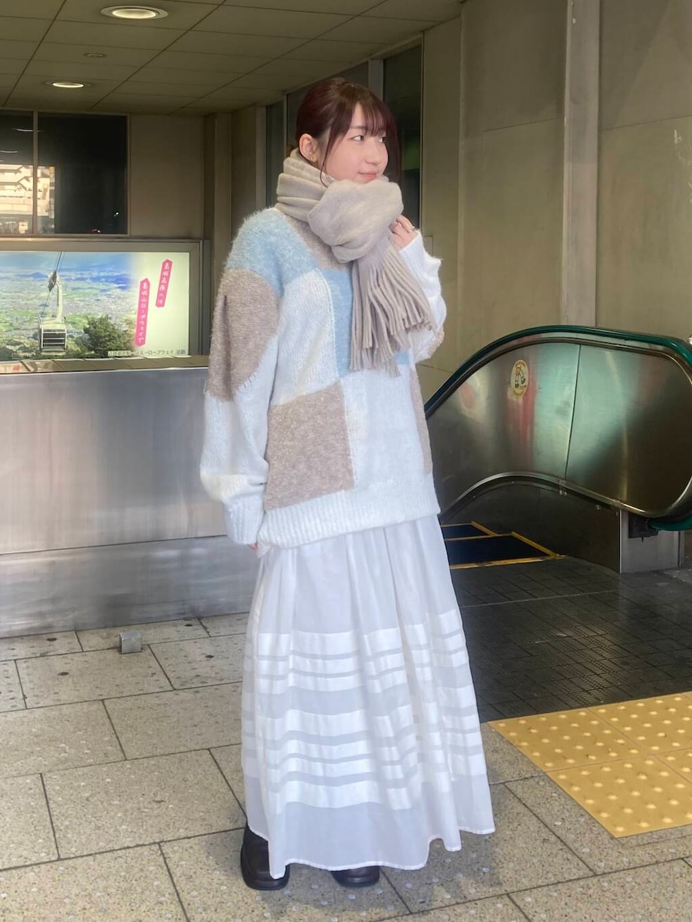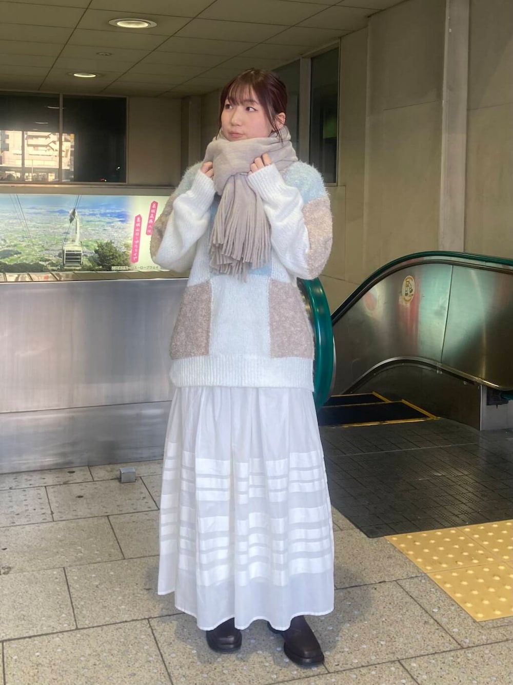 ふわふわのニットにボリュームのあるスカートで冬のホワイトコーデです!