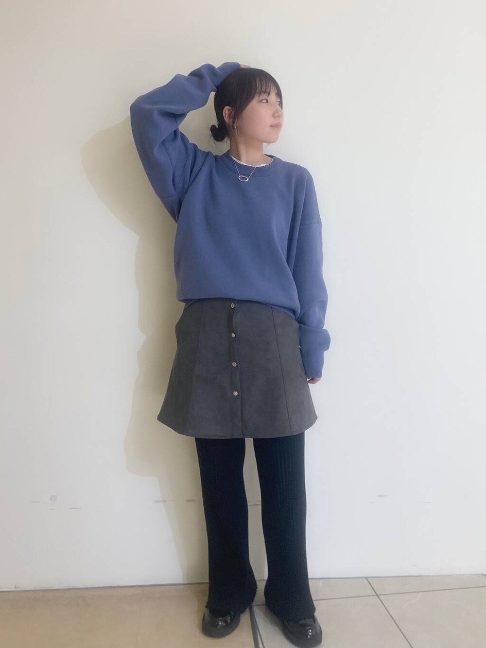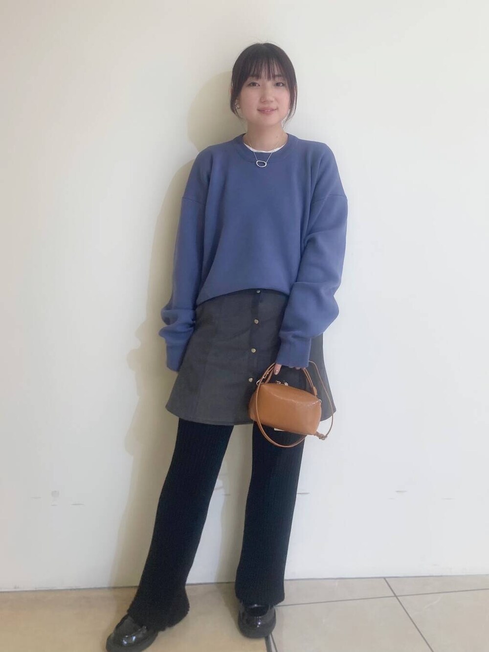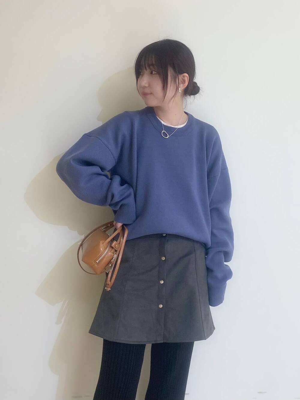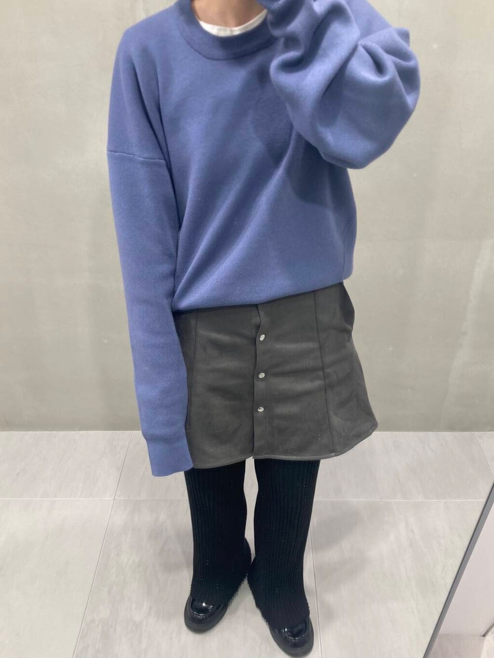 ミニスカートのフロントボタンがコーデのポイントになっていて、ニットの前だけ軽くインするとバランス良く見えます✨