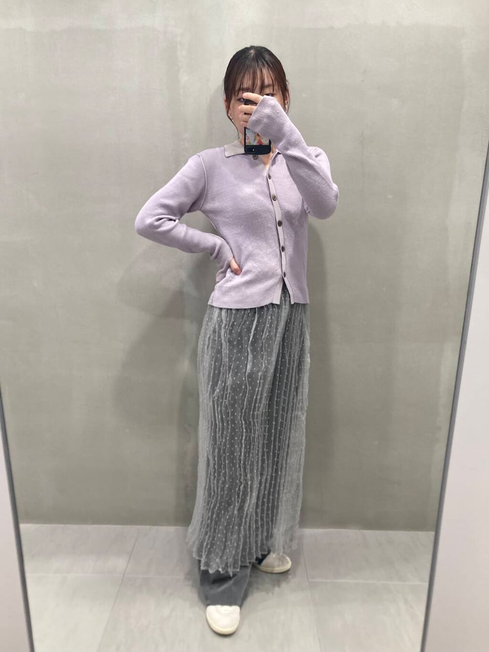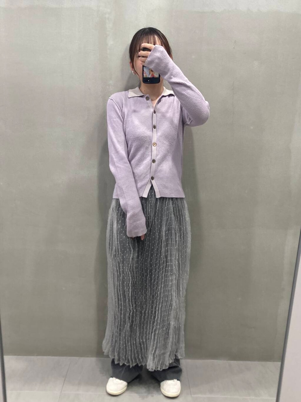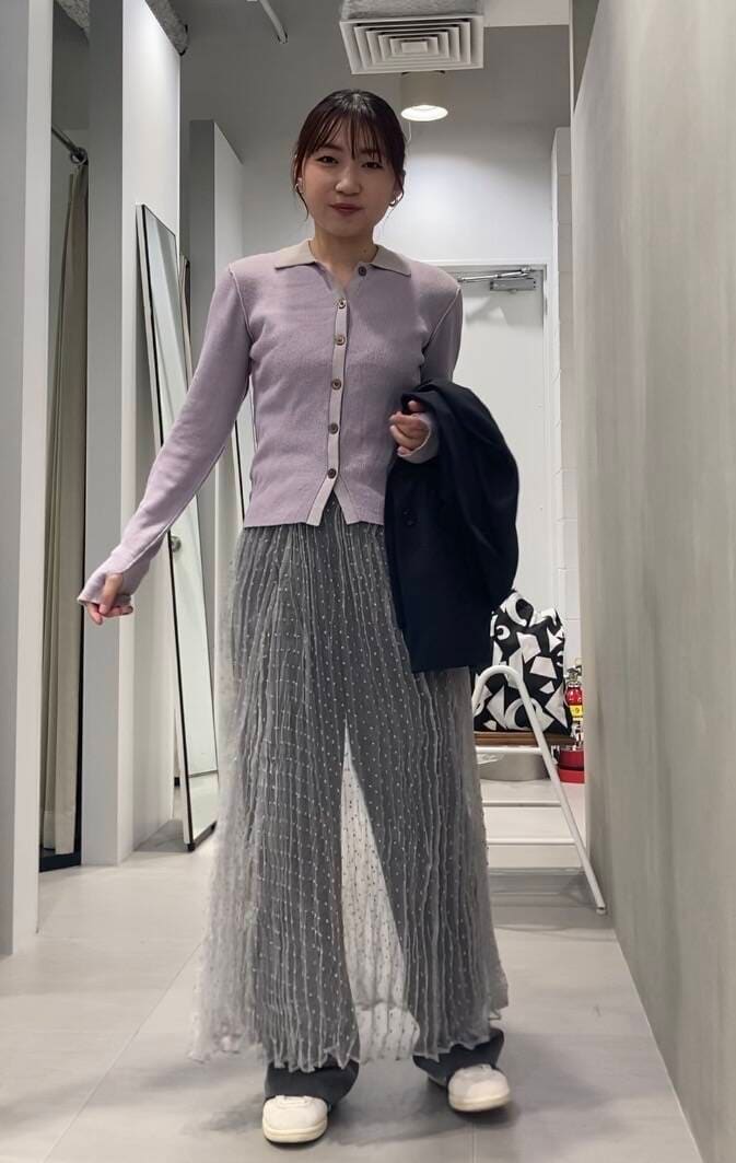顔色が明るく映えるラベンダーカラーのポロニットにグレーのアイテムを合わせて、大人のカラーコーデです!