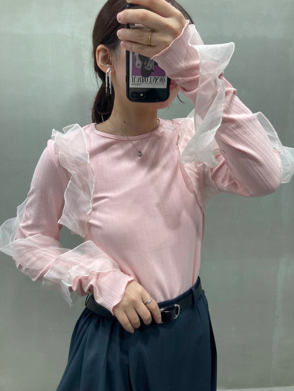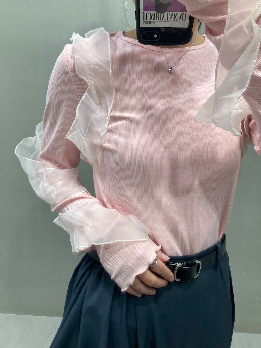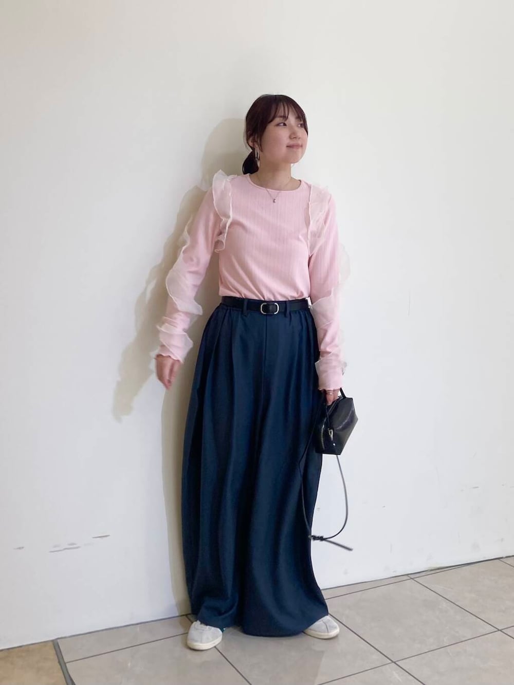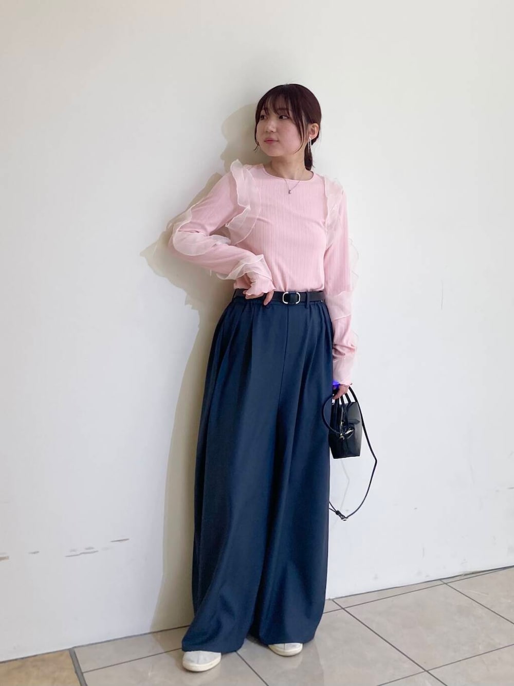 ふんわりフリルがアクセントになったトップスは、ほどよくタイトなので、ボリュームのあるワイドパンツとも相性良しです!