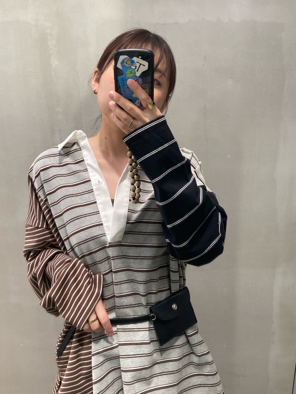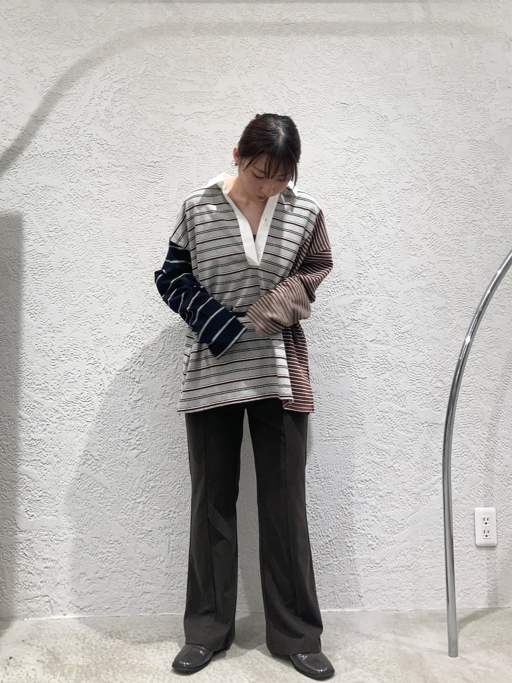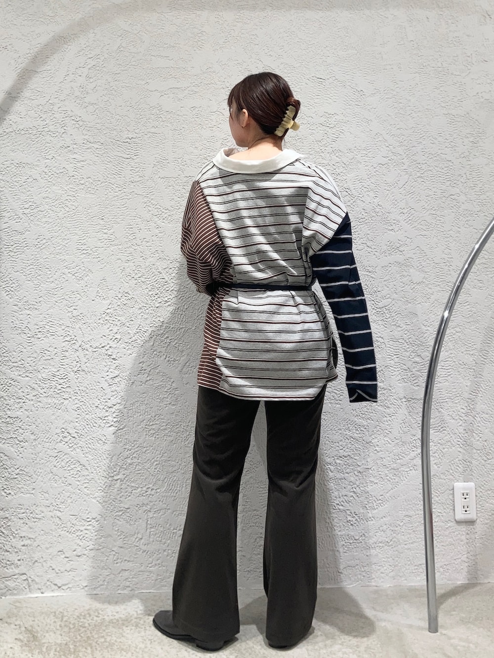 ボタンは全部開けて少し衿を抜く、ウエストマークとフレアパンツ合わせでシルエットをレディにしています!