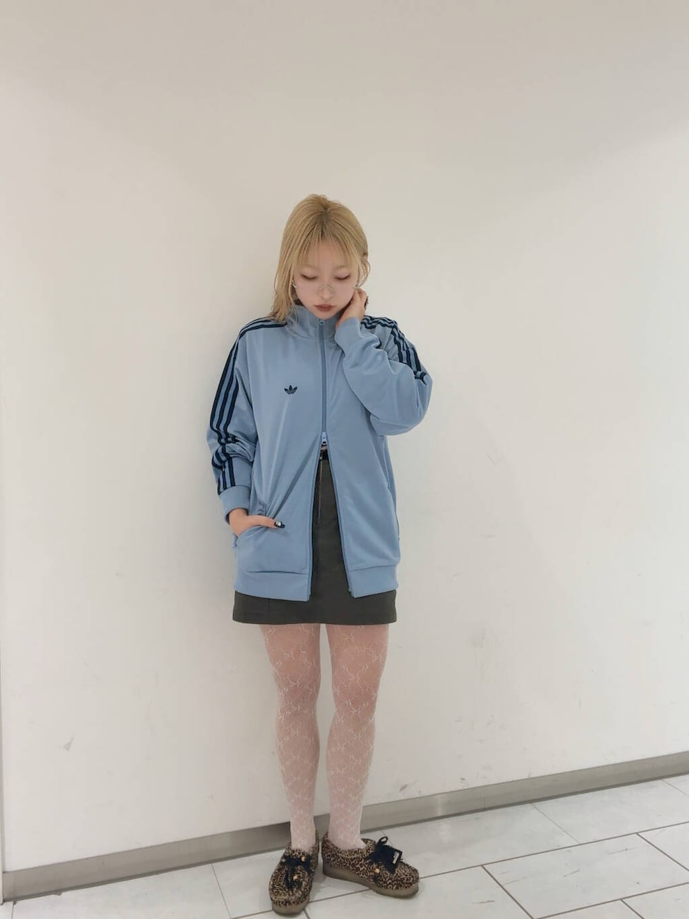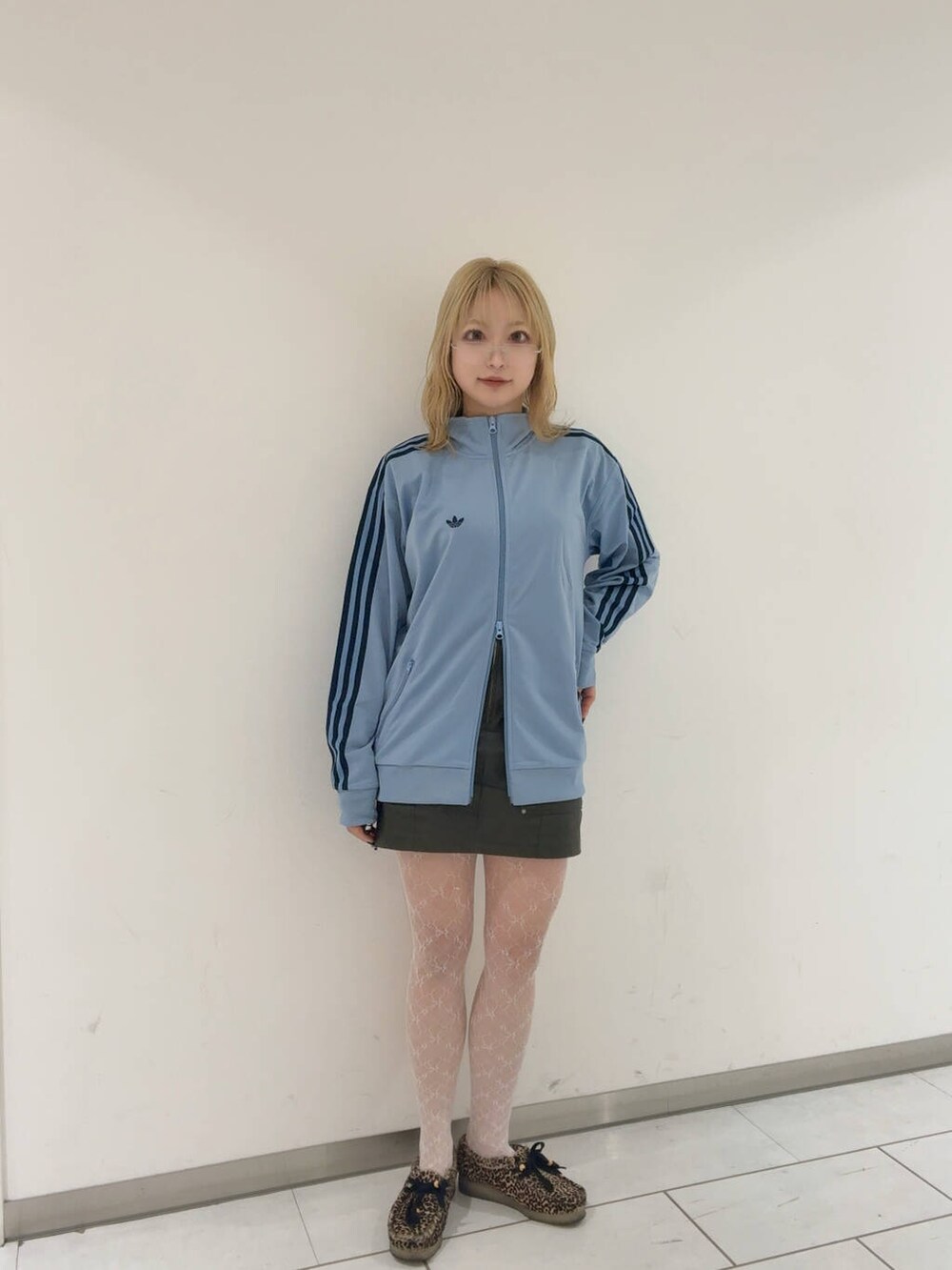 ブルーが可愛い🩵カーキのレザーのミニスカートとレースタイツで今年らしく♡