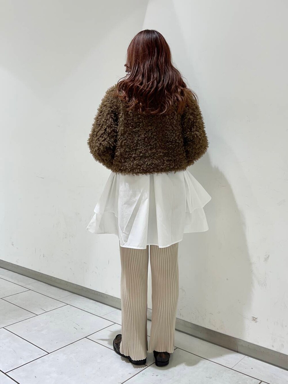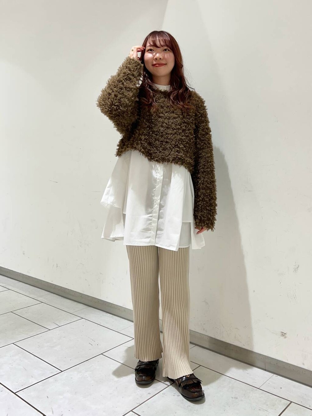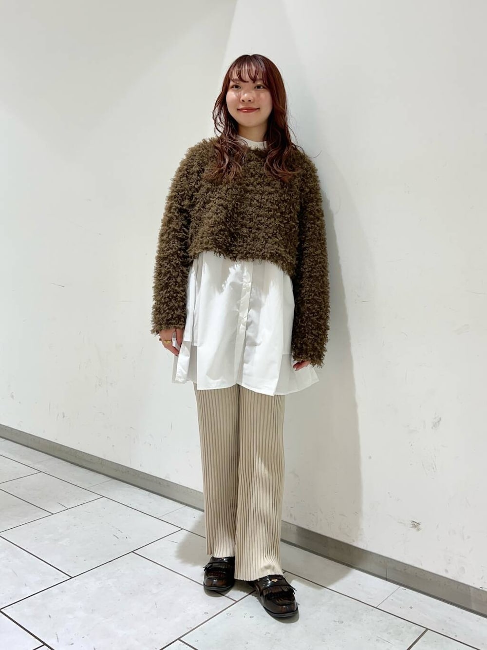 上半身にボリュームがある分、ボトムはスッキリしたリブのパンツでメリハリをつけました♩