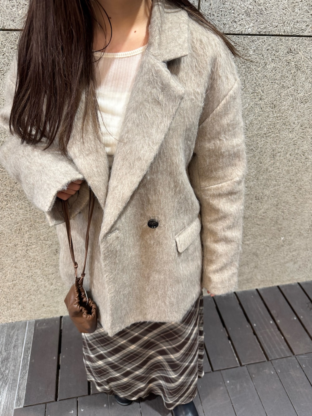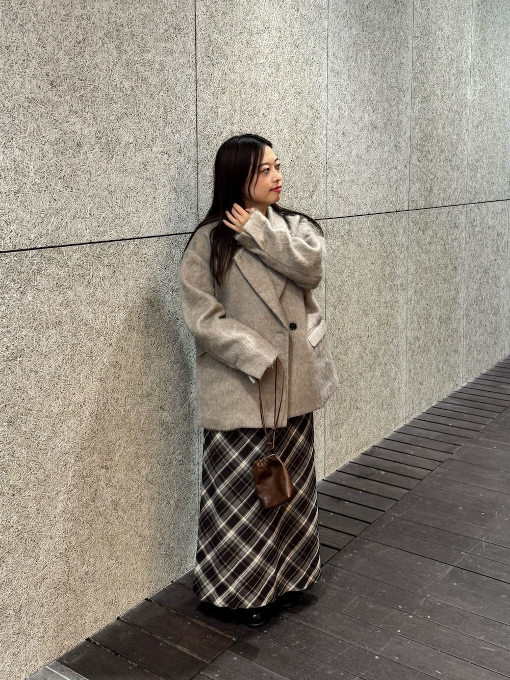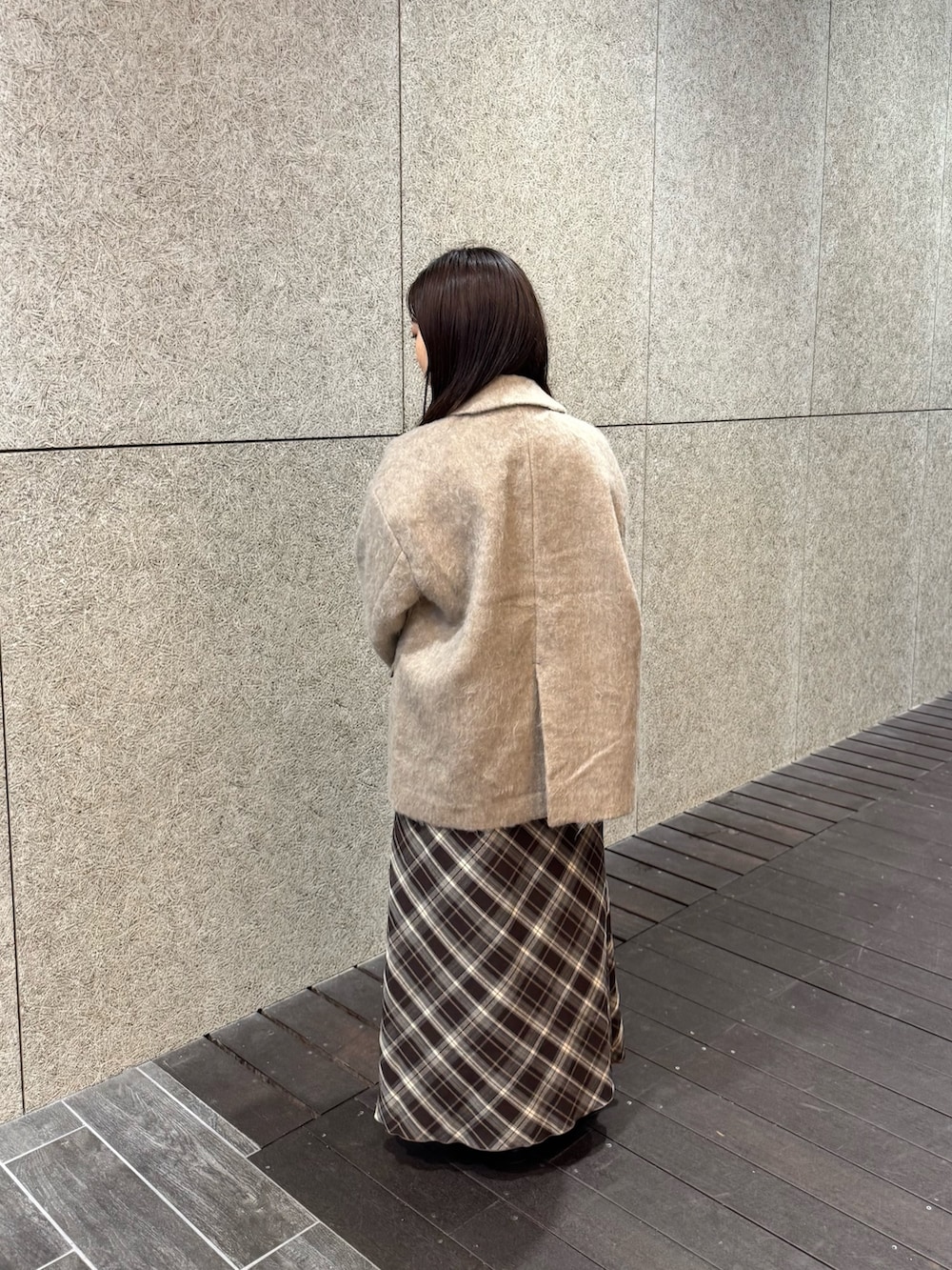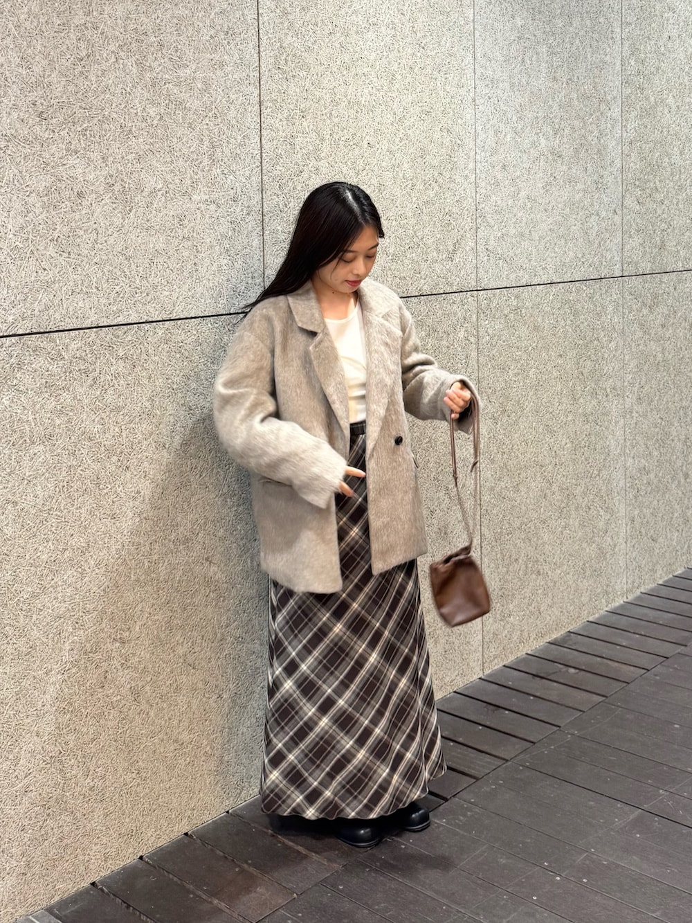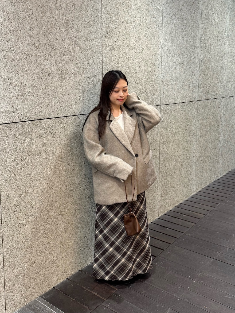 インナーに大活躍のシャーリングスリーブベロアトップスを着て、ブラウンのチェックナロースカートを合わせて同系色でまとめました。