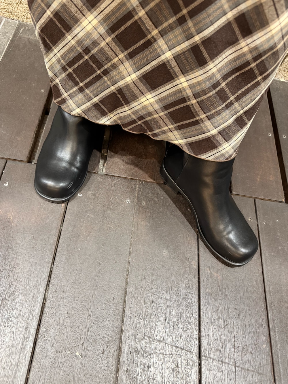 小物はポーチバッグをアクセントに、ブーツは黒で締めました。