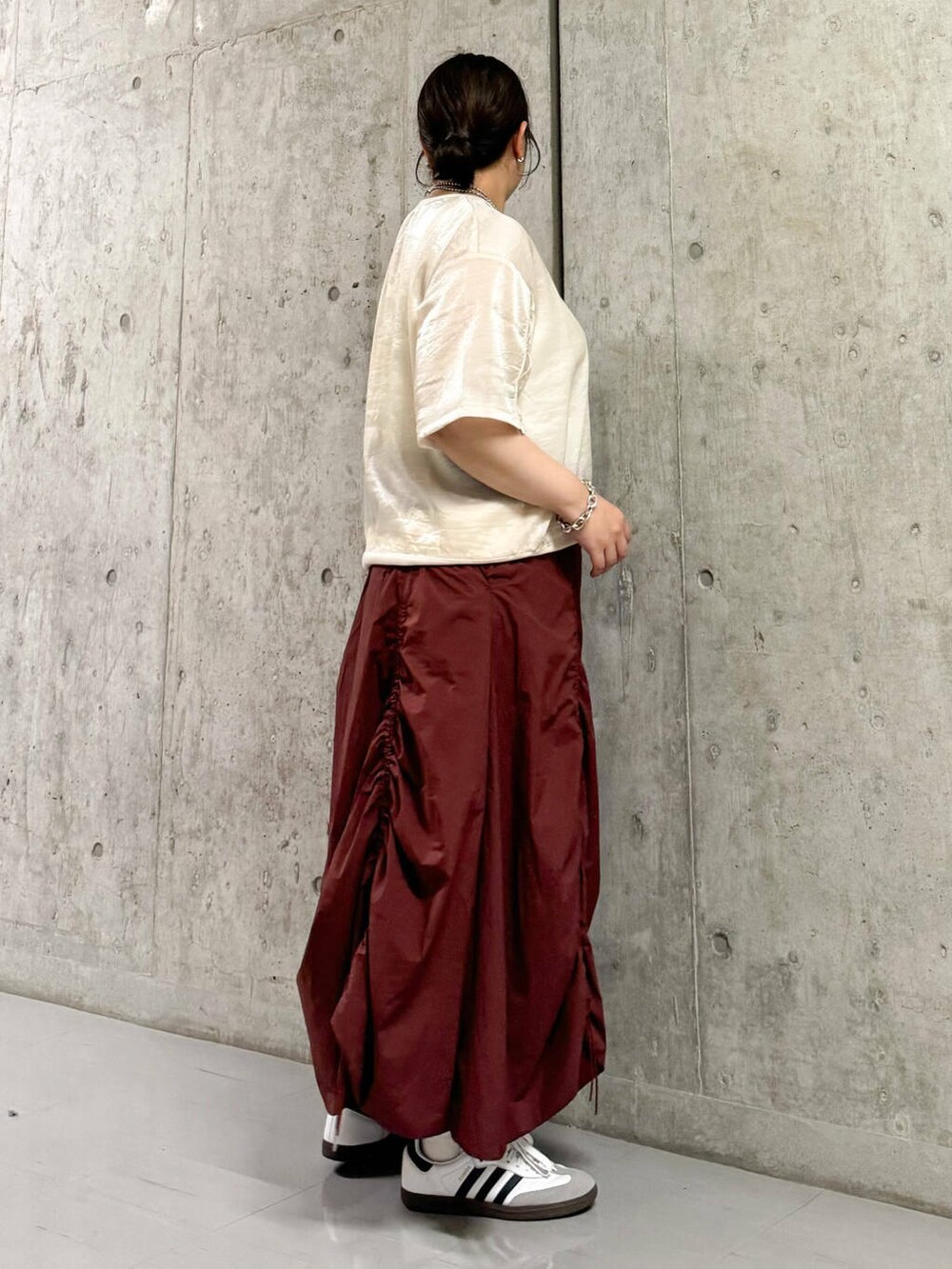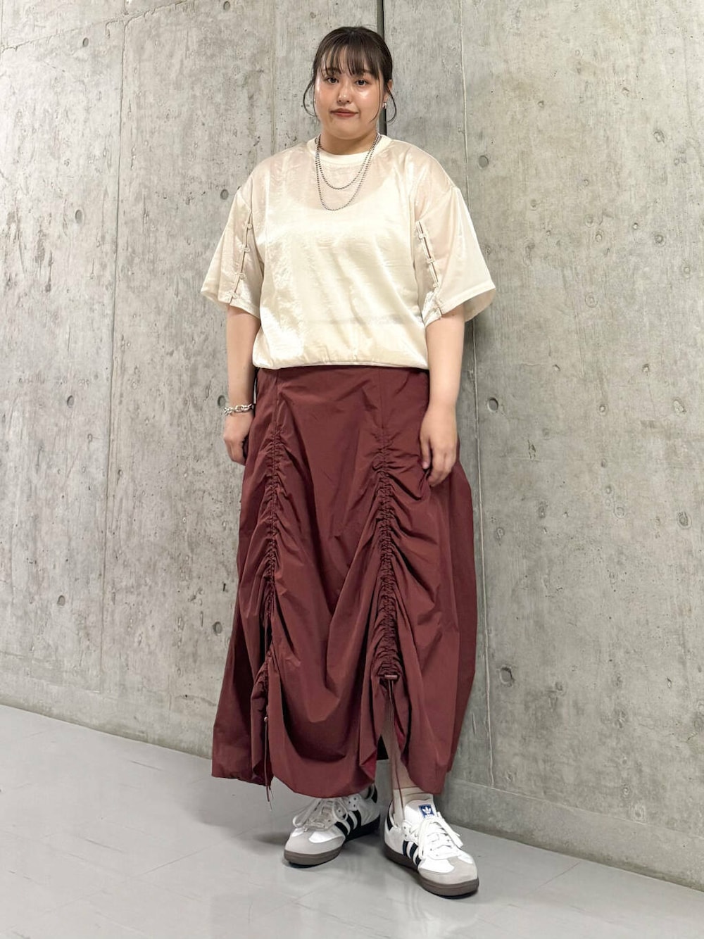 スカートはウエストゴム仕様なので穿きやすく、秋冬もニットやスウェットと合わせてロングシーズン使えて◎