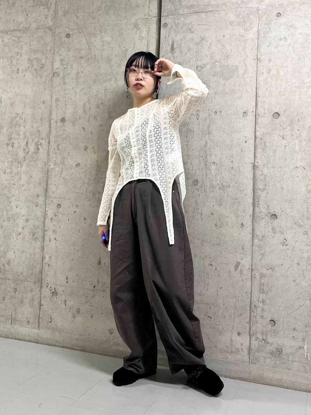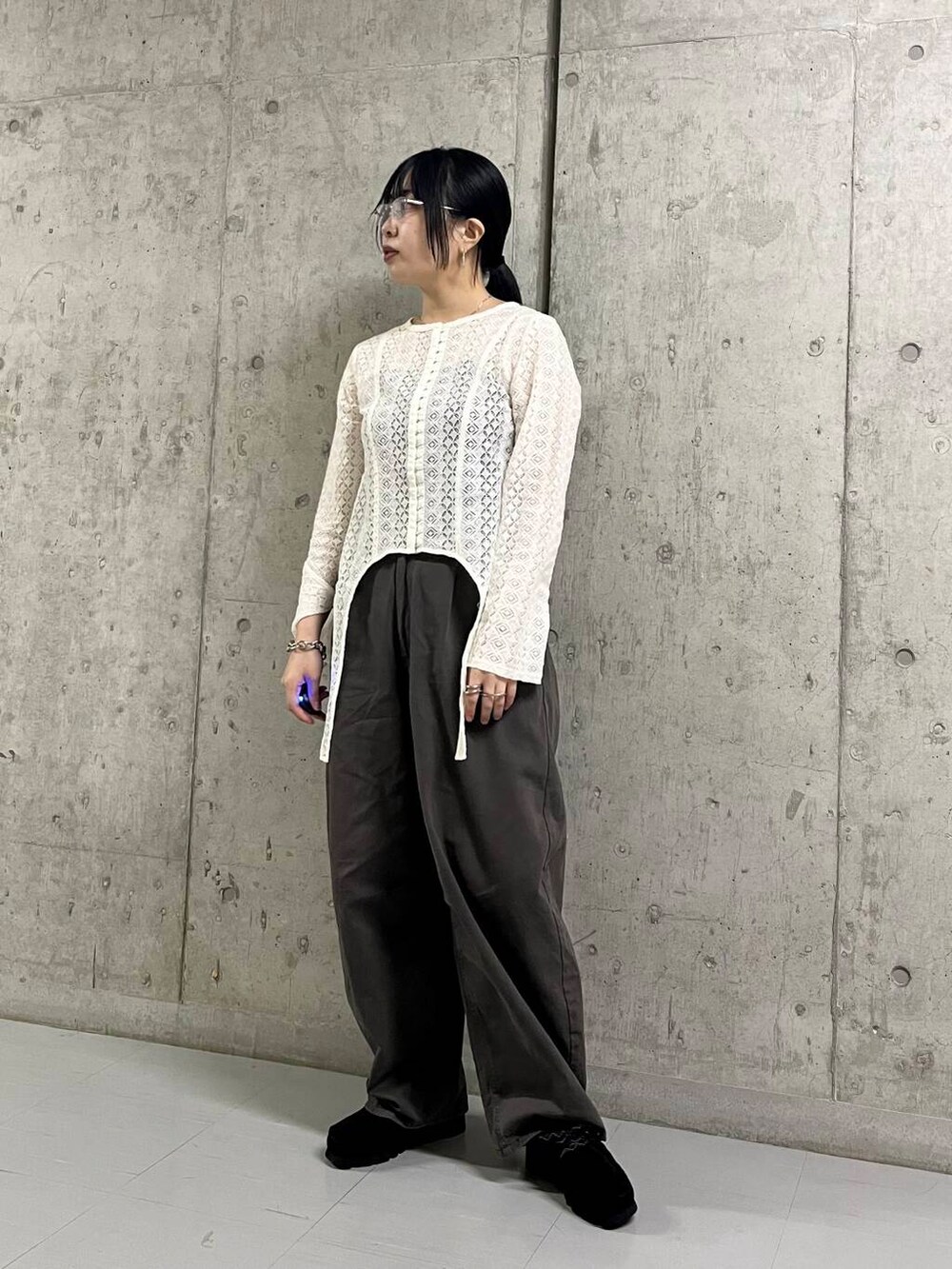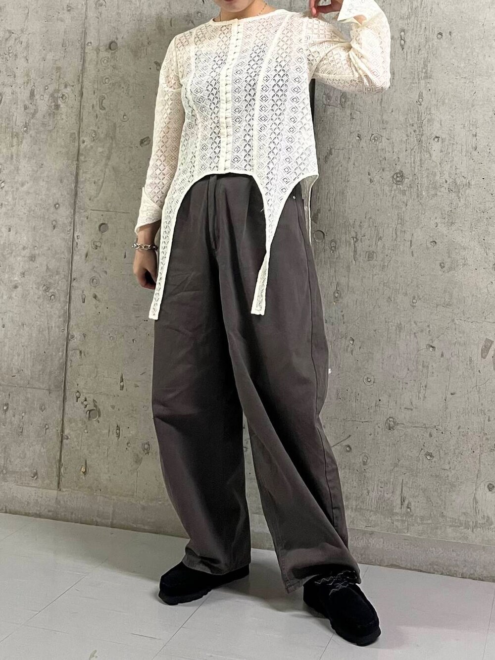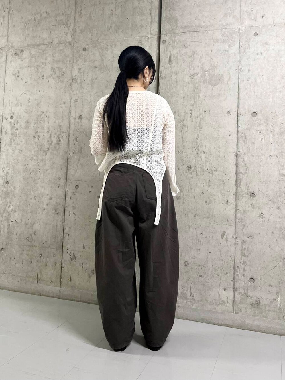 レースで甘めなので今回はコクーンシルエットのパンツでカジュアルに◎