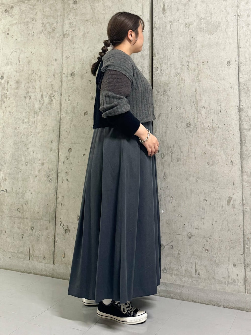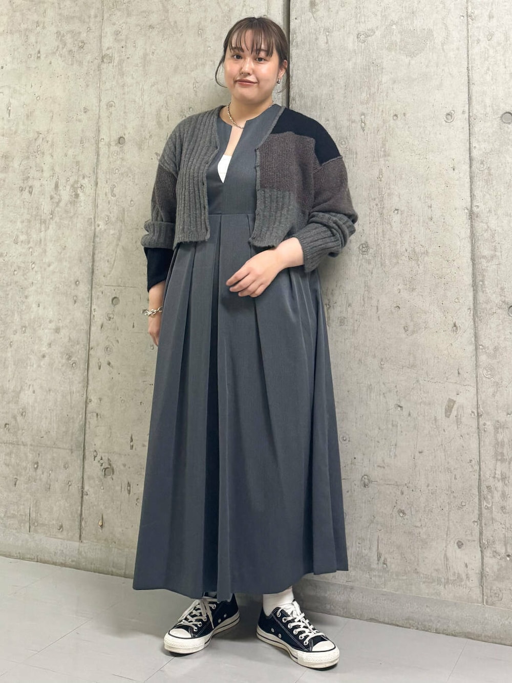 ワンピースはキーネックなので首周りもすっきり見えて、丈も長く大人っぽく着ていただけます!