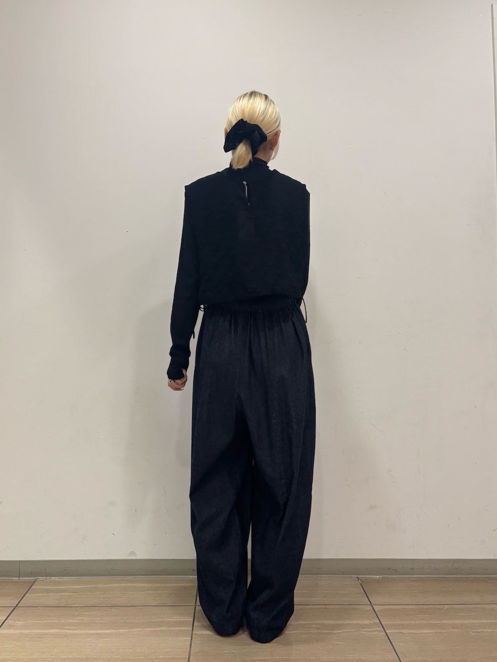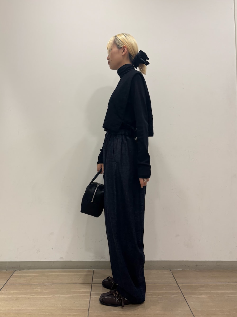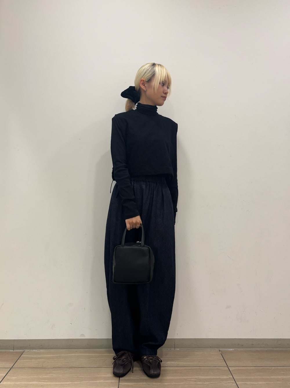 全体を黒でまとめたモード感のあるコーデで、シルエットのゆるさと上半身のコンパクトさのバランスがポイントです!デニムボリュームパンツはリラックス感を出しつつ縦ラインを強調しています!ドット柄のビブを合わせ、女性らしさとモード感を両立させたスタイリングになっております!