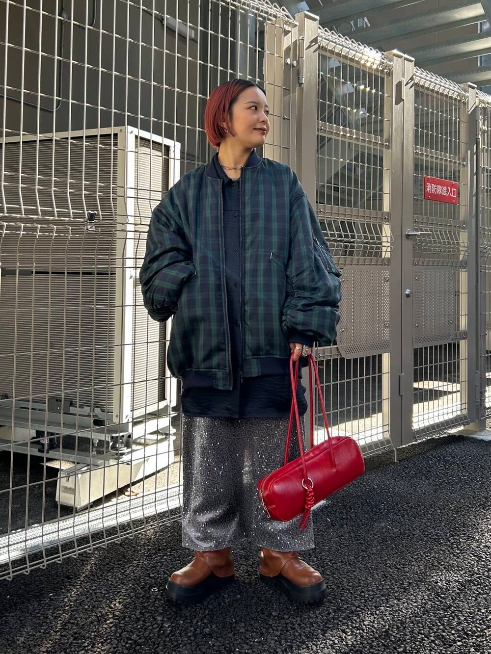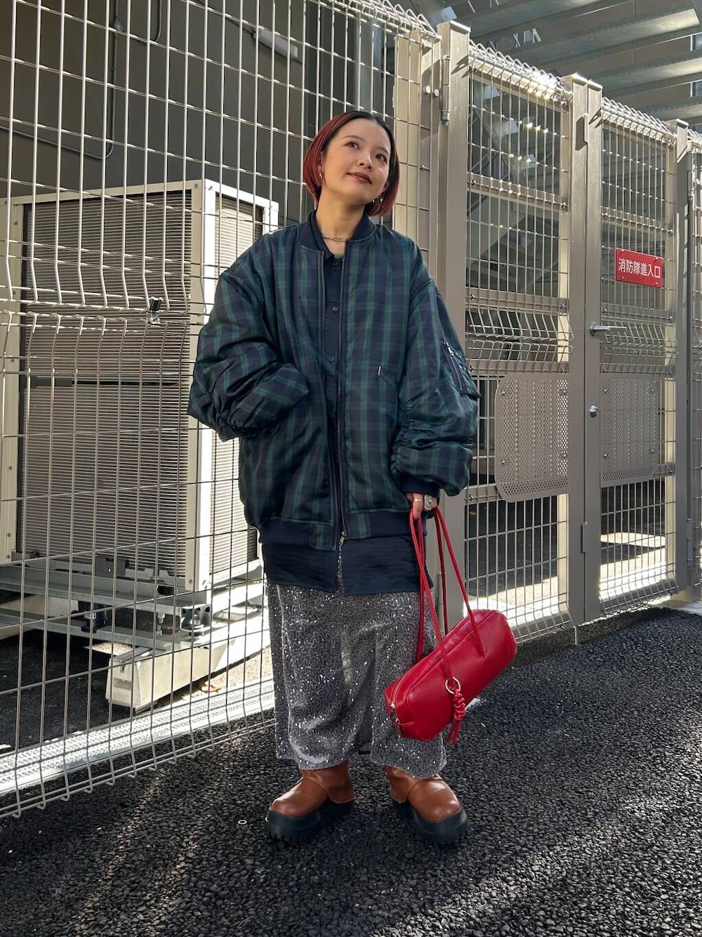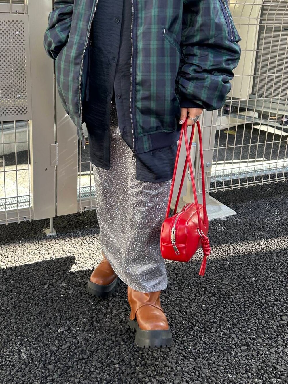 スパンコールスカートやチェックのアウターは