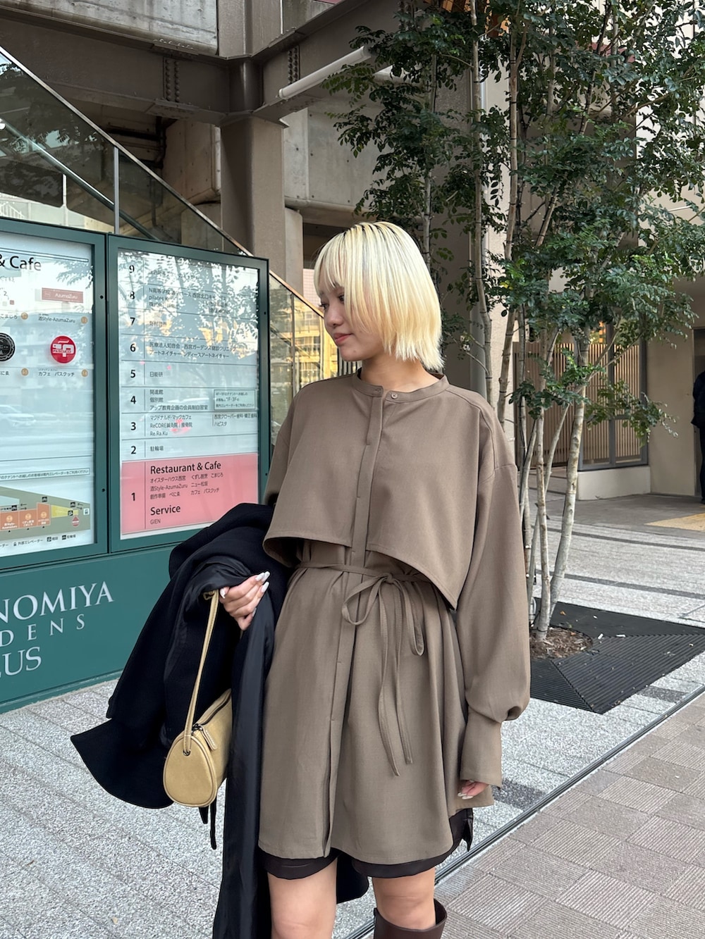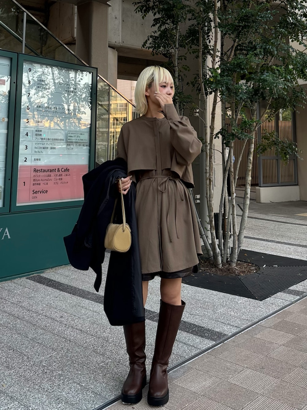 レイヤードミニシャツワンピースとブーツをブラウンで統一しつつ、アウターをブラックにすることで程よく女性らしさもありつつ、大人っぽくも合わせていただくことができます🐻➰