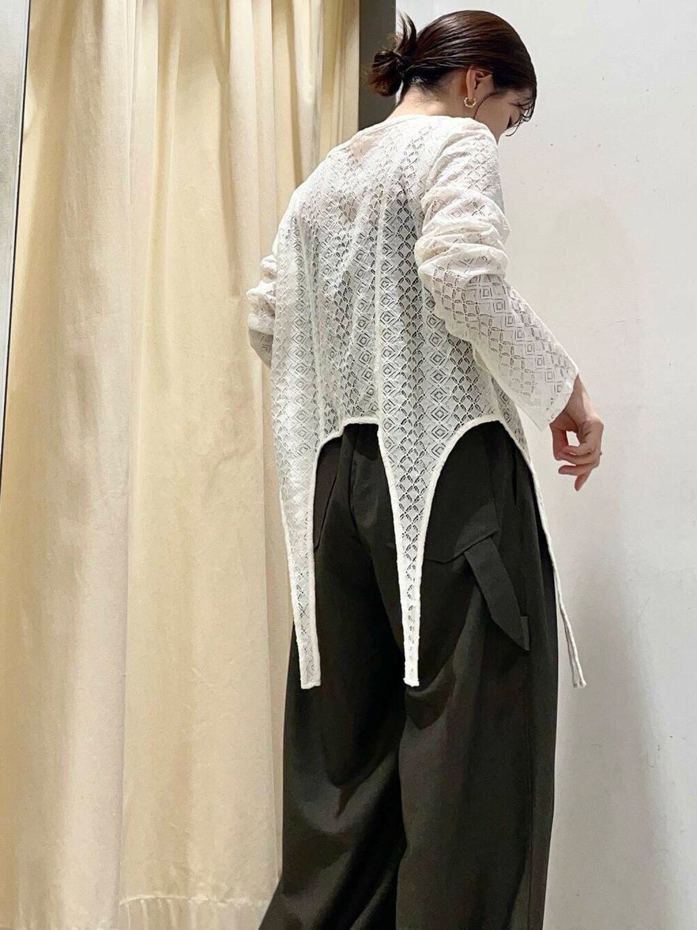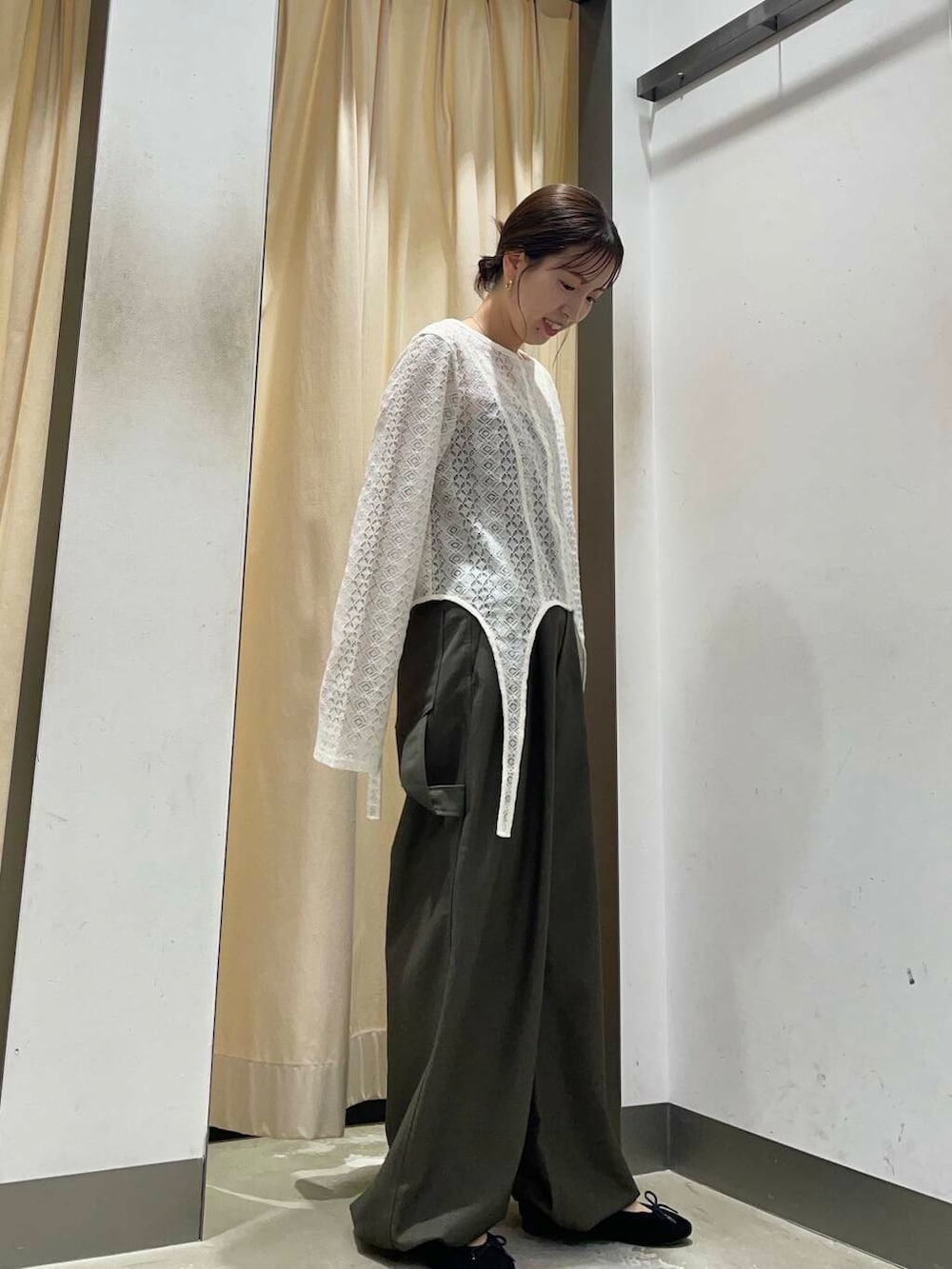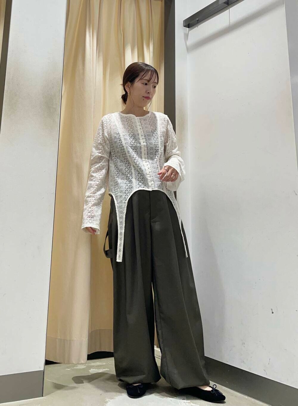 アクセントになるレーストップスを主役に、スラックスと合わせてシンプルめなコーデにしました!!